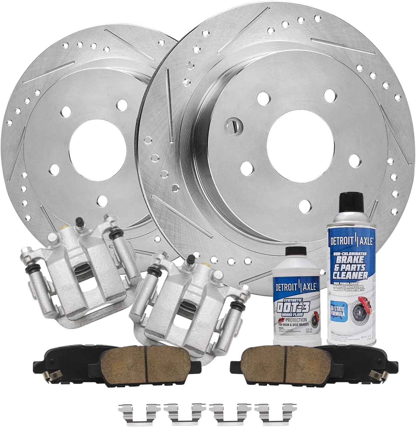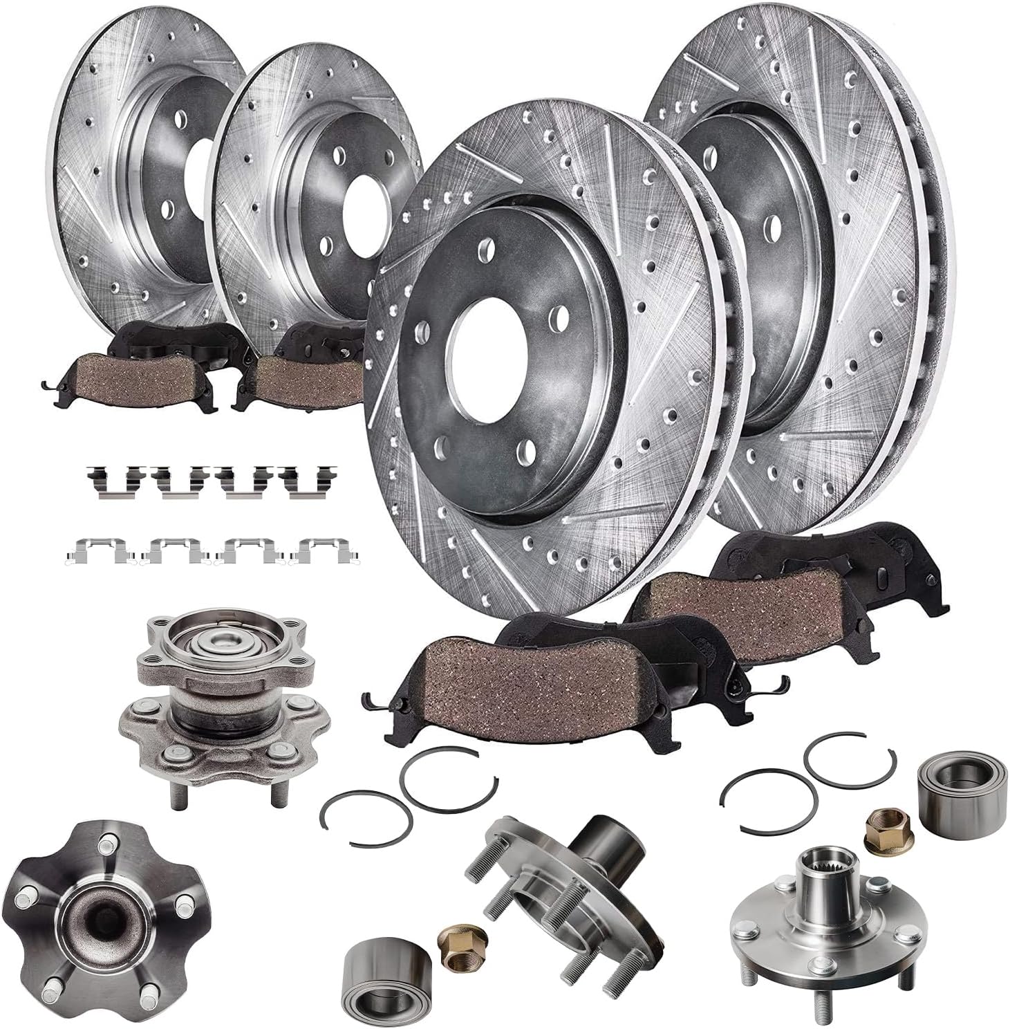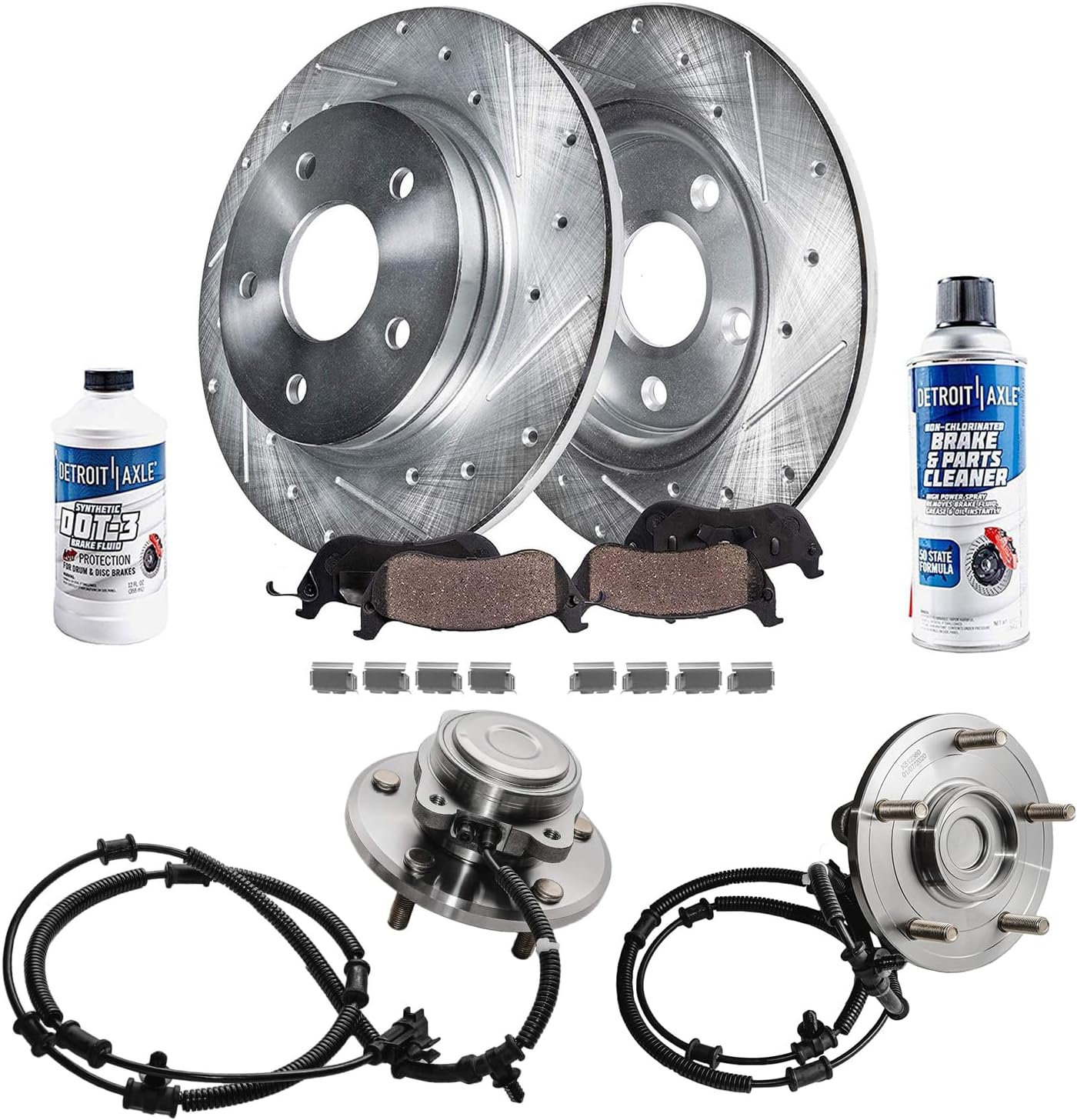 Kit Includes:2x Front Drilled & Slotted Disc Brake Rotors: S-342792x Rear Drilled & Slotted Disc Brake Rotors: S-344312x Front Ceramic Brake Pads (Hardware Included): P-13752x Rear Ceramic Brake Pads (Hardware Included): P-17792x Front Wheel Bearing & Hub Assembly - Driver or Passenger Side - 5132531x 12oz Brake Fluid Bottle1x 10oz Brake Cleaner BottleHub Specifications:Lugs: 4 BoltABS on Hub: YesFlange Type: 4-Bolt SquareFitment:**12.28 inch (312mm) Front & 10.70 inch (272mm) Rear Rotors**Replacement for 2015 Volkswagen Passat (3.6L; 1.8L)Replacement for 2015 Volkswagen Passat (2.0L-Built After 7/1/2014 )Replacement for 2016-2020 Volkswagen PassatIntroduction:Detroit Axle is a leading global retailer and distributor of OE re-manufactured and new aftermarket auto parts. We are committed to providing first-class products and outstanding customer service at an incredible value. Our rapidly-expanding product line includes CV Axles, Wheel Hub & Bearings, Suspension & Chassis parts, Complete Strut Assemblies, Shock Absorbers, Drilled & Slotted Brake Rotors, Conventional Brake Rotors, Ceramic Brake Pads, Brake Fluids, Brake Cleaners, Rack & Pinion Assemblies, Gearboxes, Drive Shafts, Transmissions, Brake Calipers, Wheel Lug Nuts, and more. With over 30 years of experience, we are proud that millions of customers around the world rely on Detroit Axle parts. We have two Metro Detroit storefront locations on the north and west sides of the city.