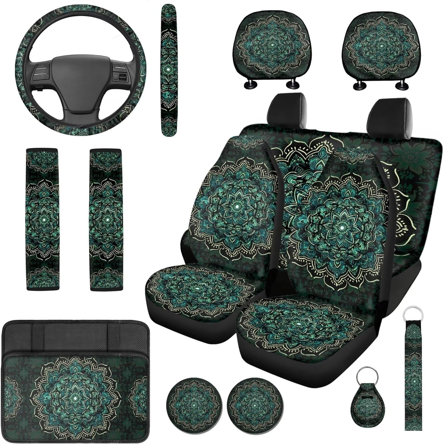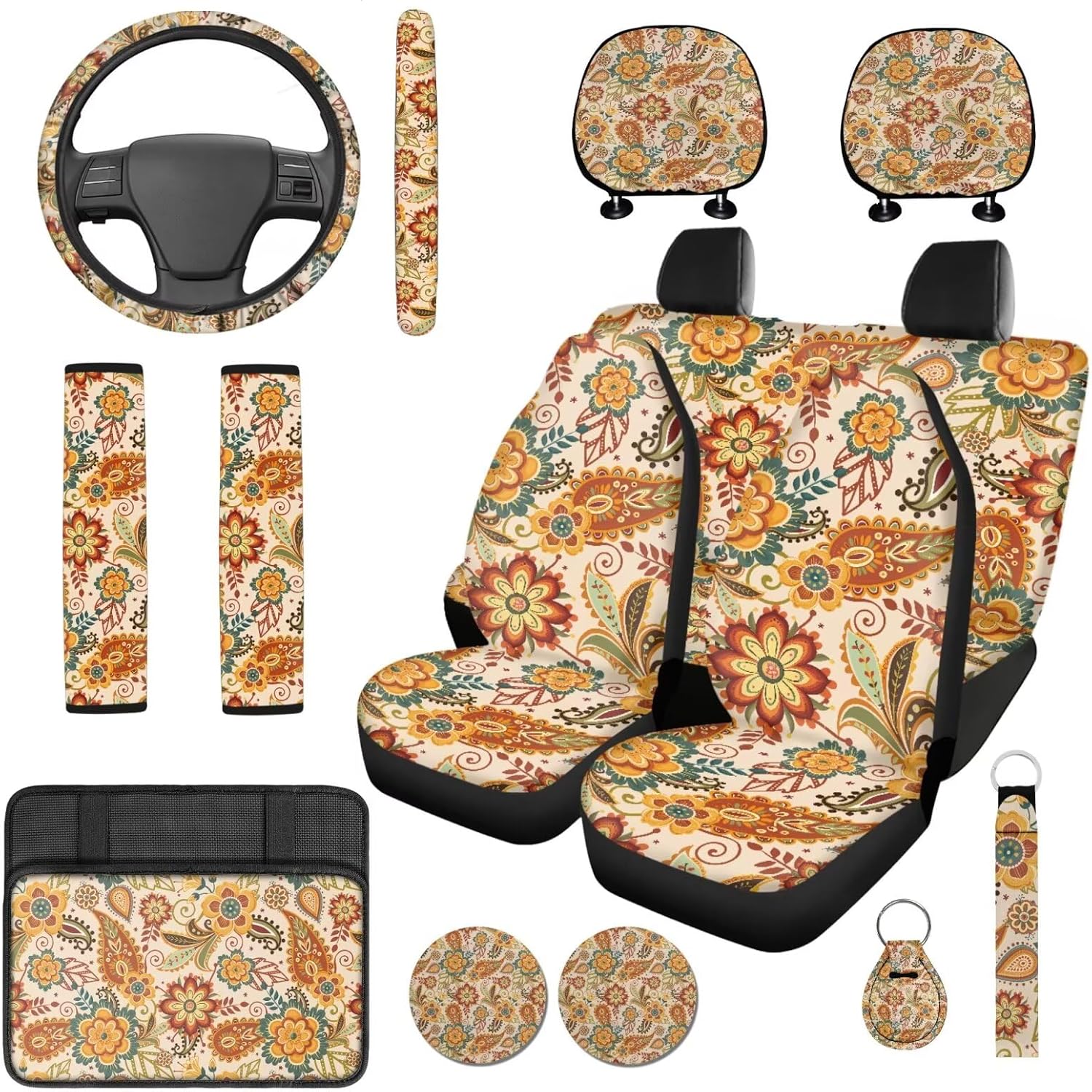 Our car front and rear cushion covers, car steering wheel covers, car coasters, car headrest cushions, car armrest cushions, car keychains, car seat belt covers are made of high quality polyester, breathable and comfortable Personalized cushion covers include, 2 front seat covers, 2 rear seat covers, 1 steering wheel cover, 2 cup cushions, 2 headrest cushions, 1 armrest cushion, 2 key fobs, and 2 seatbelt covers, for a total of 14 pieces Our seat covers are universal fit car seat cover will stretch to fit most car and suv bucket style seats Fits most vehicles- Cars, Trunks, Vans, SUV; Premium design and construction for durability with stretch seat backing for snug, no slip fit and complete finish look Car kits are easy to install, you don't need any extra tools, stretch them to the right size and slip them over various parts of your car to ensure a perfect fit for your car, easily add style to your car's interior personalize it Whether you want to protect your brand new seats or refresh your old ones, our seat cover is the perfect solution. It has excellent waterproofing properties to protect your car's front seats from rain, sweat, stains, spills, pet hair, dander, dirt,,, tears and more