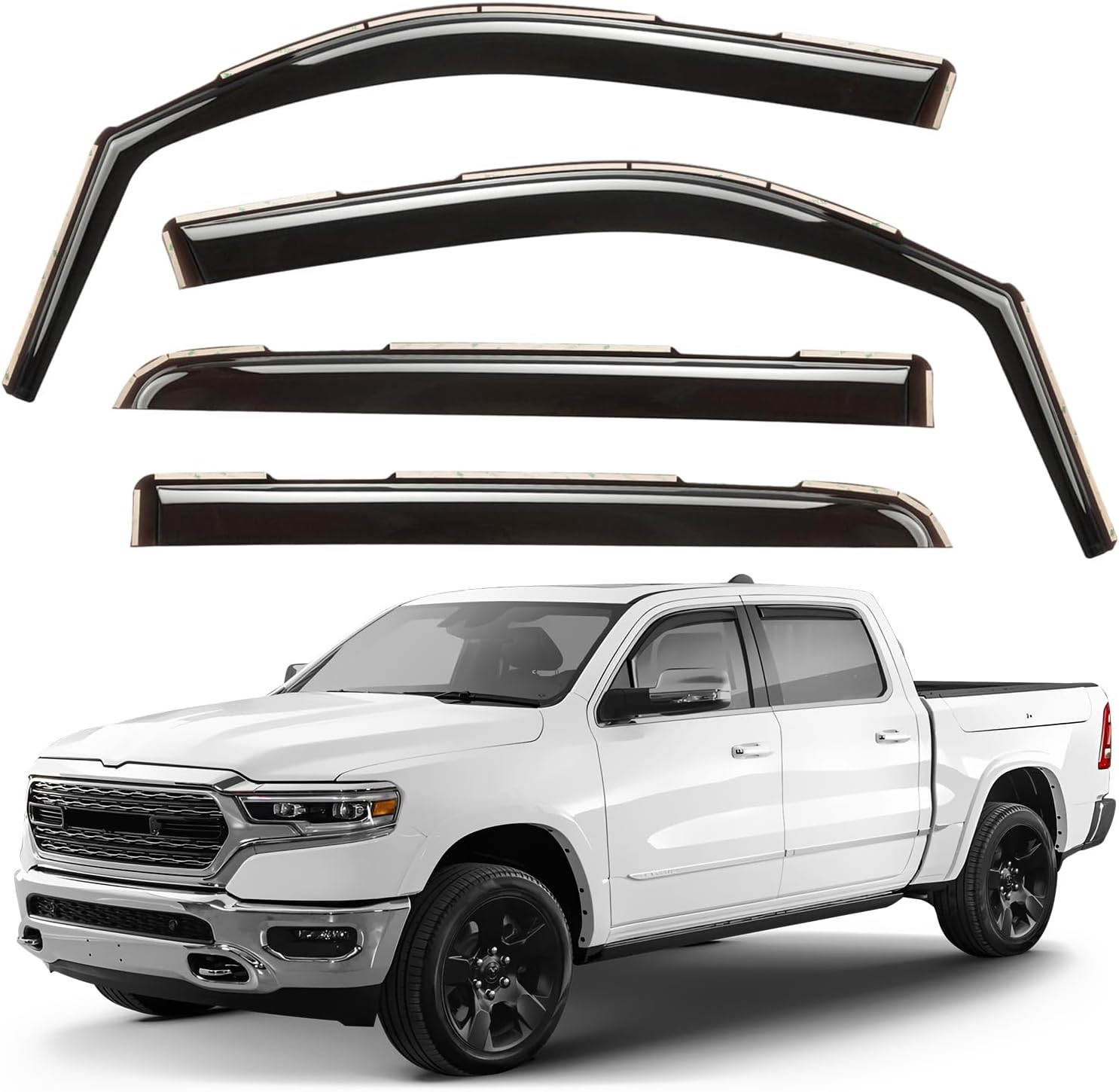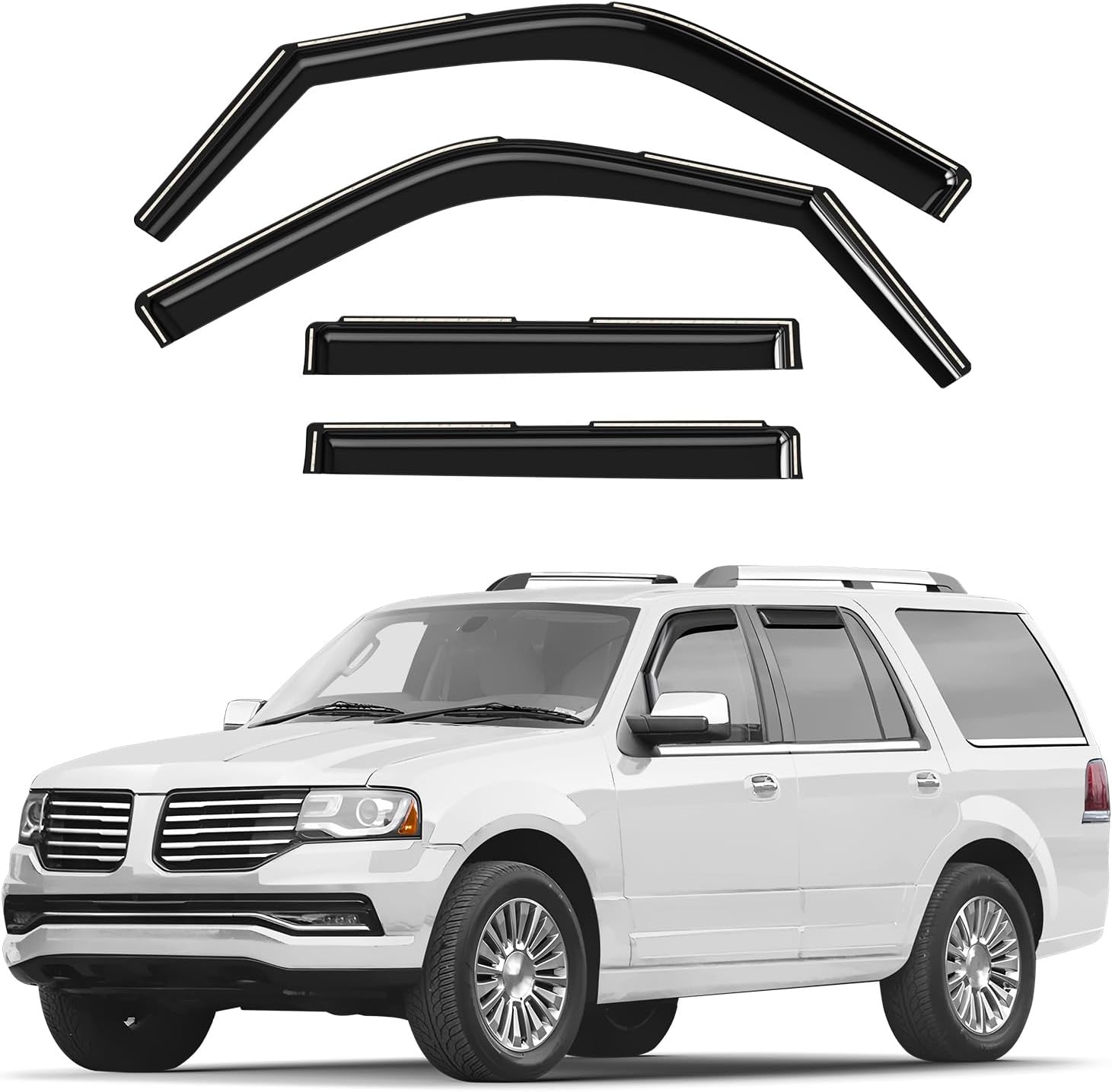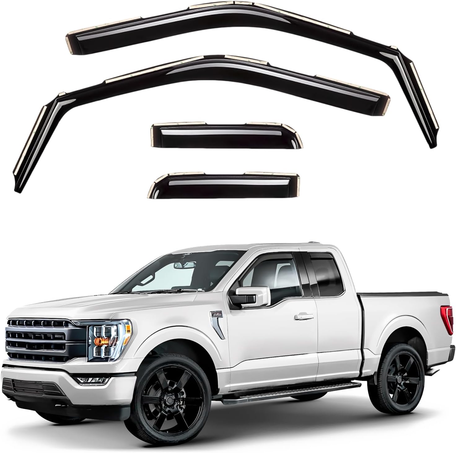 The Original GrandWheel window visors are manufactured with the polycarbonate. Other use acrylic material that cannot be same flexible and durable like polycarbonate. The GrandWheel window visors are engineered by using cutting-edge technology to reduce noise, deflect rain whilst and keep cabin cooled. The 4-piece set comes with easy to install 3M tape and installation manual. Specifications: - Condition: 100% Brand New; - Fitment: for F-150 2009-2014 SuperCrew; for F-150 SVT Raptor 2011-2014 SuperCrew; - Package includes: 4 pcs window visor deflectors (2 front/2 rear), prep pad, installation manual; - Color: Smoked black tinted; - Material: High quality polycarbonate. Features: - Fresh air even while raining; - Reduces sun glare; - Easy installation; No-drilling required; - In-channel installation; - Custom fit.