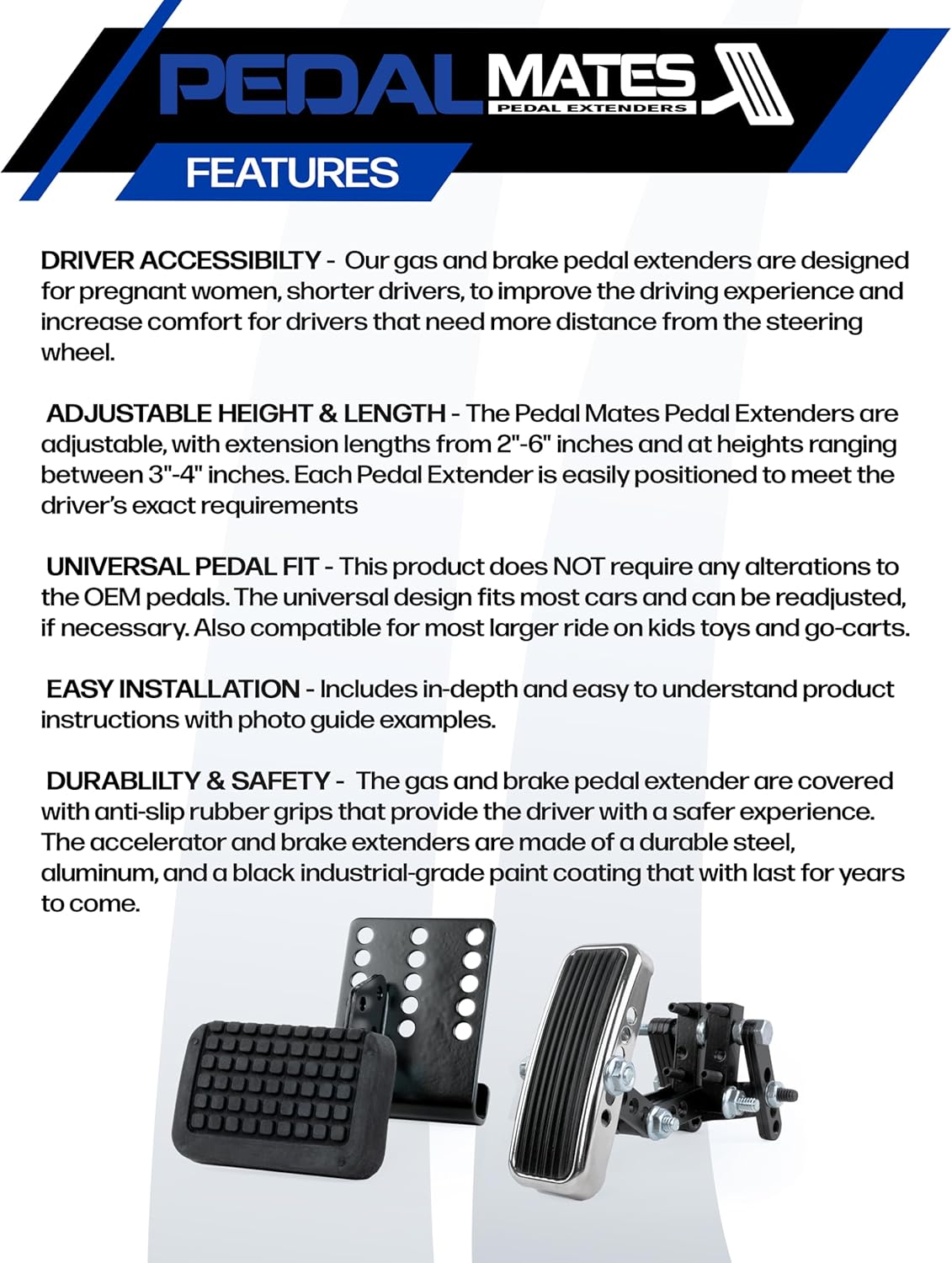 Detailed Description: Pedal Mates Pedal Extenders are ideal for individuals that are 4’5″ – 5’5″ tall, pregnant women and for those who require more distance from the steering wheel. Pedal Extenders are easy to install by securing over your vehicle’s existing gas and brake pedals. The pedal extenders are also easy to uninstall and leaves no evidence behind when removed. This product is highly recommended by many safety professionals to increase distance from the air bag and enhance overall safety. Pedal extenders are specifically made to improve the driving experience and increase comfort for drivers. The accelerator pedal extender is designed to accommodate various pedal widths, securely tightening to the existing pedal with locking screws. The brake pedal extender is designed to be fully adjustable, with extension lengths from 2"-7" inches and at heights ranging between 3"-4" inches. NOTE: The gas pedal extender does not always work on pedals that hinge from the floor. Sitting too close to a Driver Side Airbag can not only be uncomfortable, but dangerous! Government experts recommend that a driver's face and chest be positioned at least 10-12" from the airbag *(NHTSA). While disconnect devices are available, they compromise personal safety and still leave the driver uncomfortably close to the steering wheel. Brake and Gas Pedal Extensions provide a safe, simple and inexpensive alternative for those who are short-stature, pregnant, or have hip or knee problems. NOW YOU CAN DRIVE SAFELY AND CONFIDENTLY!