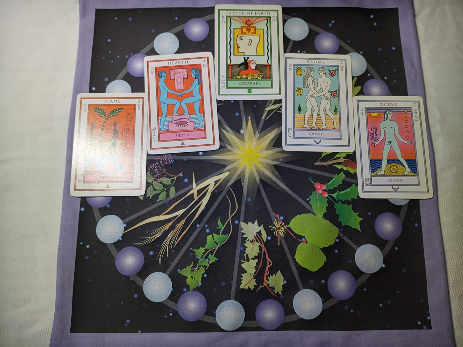 An Original Design by Artist Wendy Wilson of Magic in Your Living Room The design of this Pagan altar cloth or Wiccan altar cloth is a symbolic representation of the Celtic tree calendar. A tradition says that the Celtic Calendar was a lunar calendar and the months were named for plants, mostly trees. This design shows the wheel of the year as it goes through the full moons and the dark of the moon. It illustrates the plant each month is named for. A paper description of the calendar is included with each order. This is a beautiful altar cloth, about 18 inches or 45cm square. professionally printed from my design. Now, in your choice of fabric, either all-natural cotton (2-ply with a cotton backing) or polyester satin (single ply with a narrow hem). All altar cloths are available, as a special order, in any size up to about 34" square. Special orders take about 10-14 days. Just contact me with which design you want and what size. Prices scale with size. The altar tools are just for display purposes. All I am selling is the altar cloth. * Samhain * Yule * Imbolc * Beltane * Litha * Lammas * Mabon *