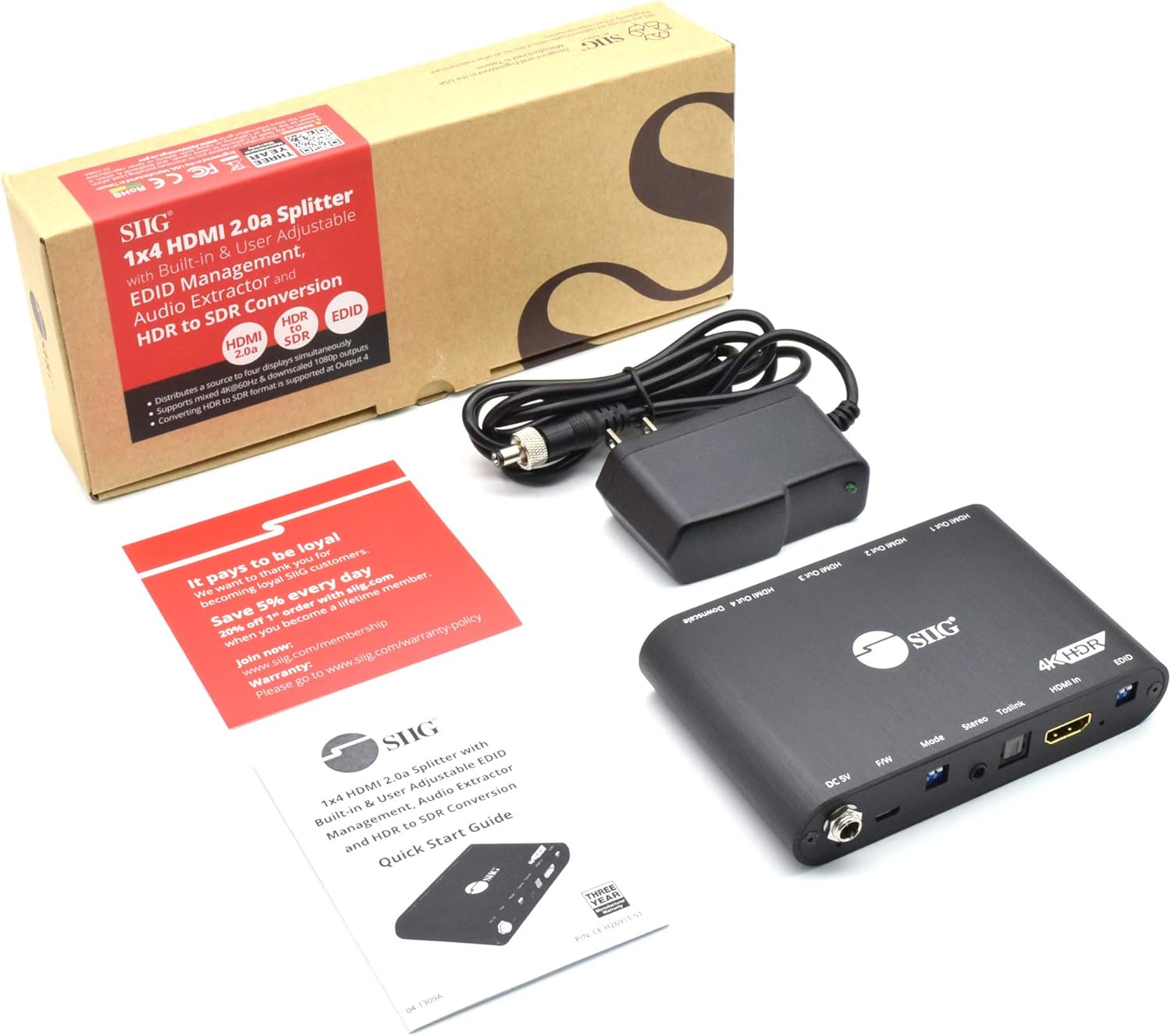 Specifications:Chipset: IT6664ECompliant with HDMI 2.0, HDCP Bypass 2.2 specificationsResolution: up to 4K@60Hz YUV 4:4:4 8bits, HDR 4K@60Hz YUV 4:2:0 10bitsVideo bandwidth: 18Gbps (single-link 600MHz)Video support: 480p/720p/1080i/1080p/HDR 4K@60Hz (YUV 4:2:0 10bits)/4K@60Hz (YUV 4:4:4 8bits)Resolution up to 4K (3840 x 2160) @60HzSupports default EDID and EDID learning from HDMI displayBuilt-in Micro-USB port for firmware update for expanding compatibilityAudio: DTS-HD Master Audio, Dolby TrueHD, Dolby Digital, DTS, DVD-Audio, LPCM, SACD, MPCMHDMI cable length:4K @60Hz: Up to 10 meters (5m/In ; 5m/Out)1080p & 4K@30Hz: Up to 15 meters (5m/In ; 10m/Out)LED indicators for power and signal statusESD protection: ±15kV Air / ±8kV ContactProduct:Dimensions: 4.72" (L) x 0.94" (H) x 3.07" (W)Weight: 0.47lbsColor: BlackHousing material: Aluminum Connectors:1x 19-Pin, HDMI, Type A, Female, Input4x 19-Pin, HDMI, Type A, Female, Output1x S/PDIF Toslink, Female, Output1x 3.5mm Stereo Audio Jack, Output1x 4-pin DIP switch, Downscale control1x 2-pin DIP switch, F/W and Service control1x 2-pin DIP switch, EDID mode1x 5-pin Micro USB, Female, F/W update1x Power jackPower adapter:Input: 100-240VAC, 50/60 HzOutput: DC 5V/2AUL Listed: E253376 /Level: VIEnvironmental conditions:Operating temperature: 32 to 104 degrees FStorage temperature: -4 to 140 degrees FRelative humidity: 20 to 90% RH (non-condensing)Certifications/Standards: FCC, CE, RoHSTAA compliantCountry of origin: TaiwanPackage contents:1x4 HDMI 2.0a Splitter with Built-in & User Adjustable EDID Management, Audio Extractor and HDR to SDR ConversionPower AdapterQuick start guide