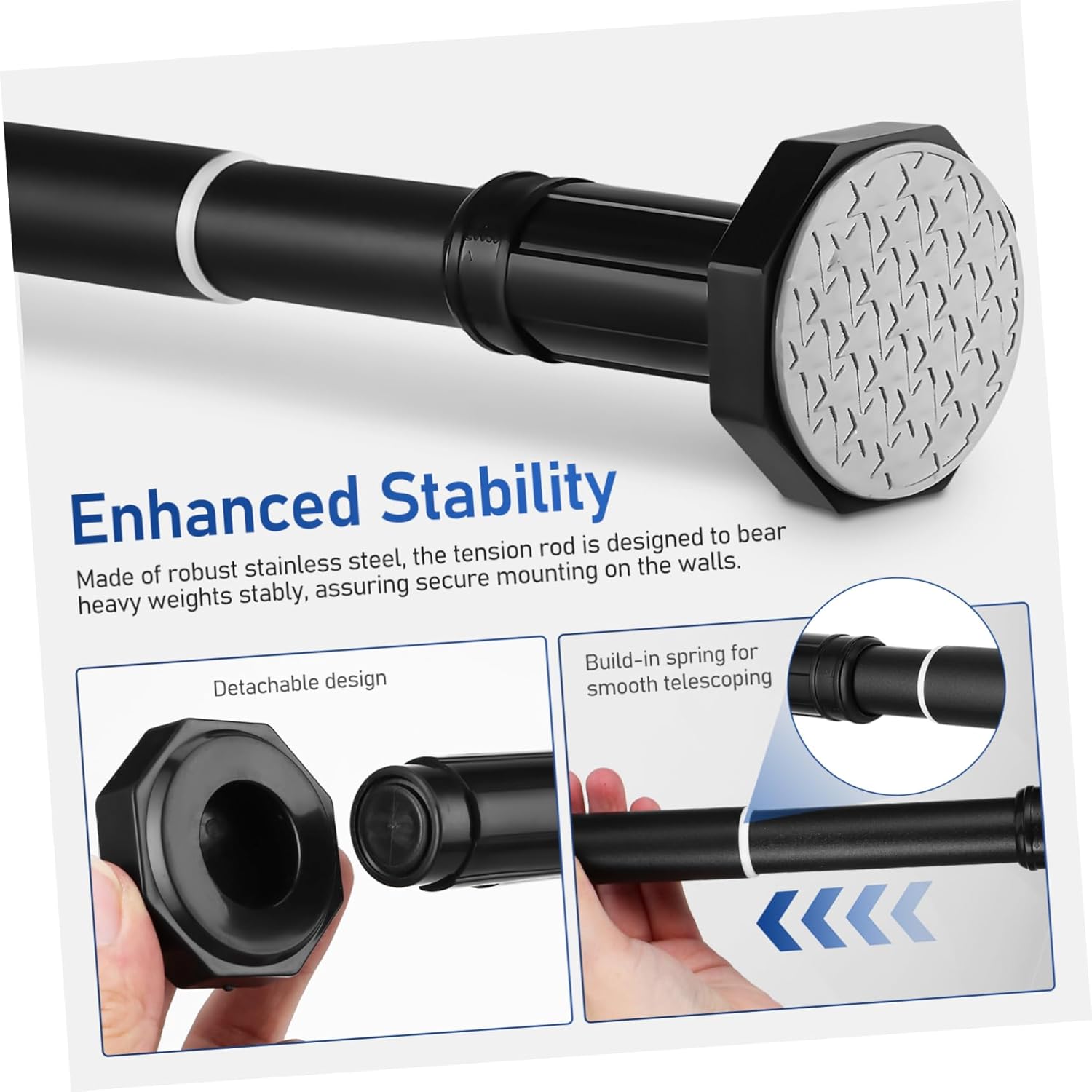Package Include 1 x tension rod Features -Size: 107.00X2.40X2.40cm/42.05X0.94X0.94in Extendable Shower Curtain Rod -No damage installation: The no-drill curtain rod provides an easy, drill- setup that won't damage your walls, tiles, or surfaces, preserving your home's integrity Shower Rods For Bathroom. -Versatile functionality: The extendable curtain rod is also for hanging window curtains, room dividers, clothes, maximizing space utilization Telescopic Curtain Rod. -Heavy-duty strength: Constructed from stainless steel, this tension rod supports heavy loads, can be securely attached onto walls without falling easily Clothes Drying Rod. -Material:Stainless steel Window Curtain Rods -Sleek elegance: The stainless steel finish of this tension curtain rod provides a sleek, modern look that complements any decor while ensuring longevity Closet Rod. -Telescopic adjustment: With its adjustable length, the shower curtain pole fits a wide range of spaces, offering flexible sizing for versatility in any your house Curtain Rod No Drill. -Length range: 110-200cm(the rod only, two ends are excluded) Extendable Curtain Poles -Color:Black Shower Curtain Rods Spring TensionGoods DescriptionShower Curtain Pole This sleek rod effortlessly extends to accommodate various needs, whether it's partitioning your bathroom with a shower curtain, dressing windows with graceful draperies, or creating instant hanging space for clothes.Extendable Shower Curtain Pole Elevate your home organization with our Stainless Steel Tension Rod, designed for heavy-duty performance without the need for drilling