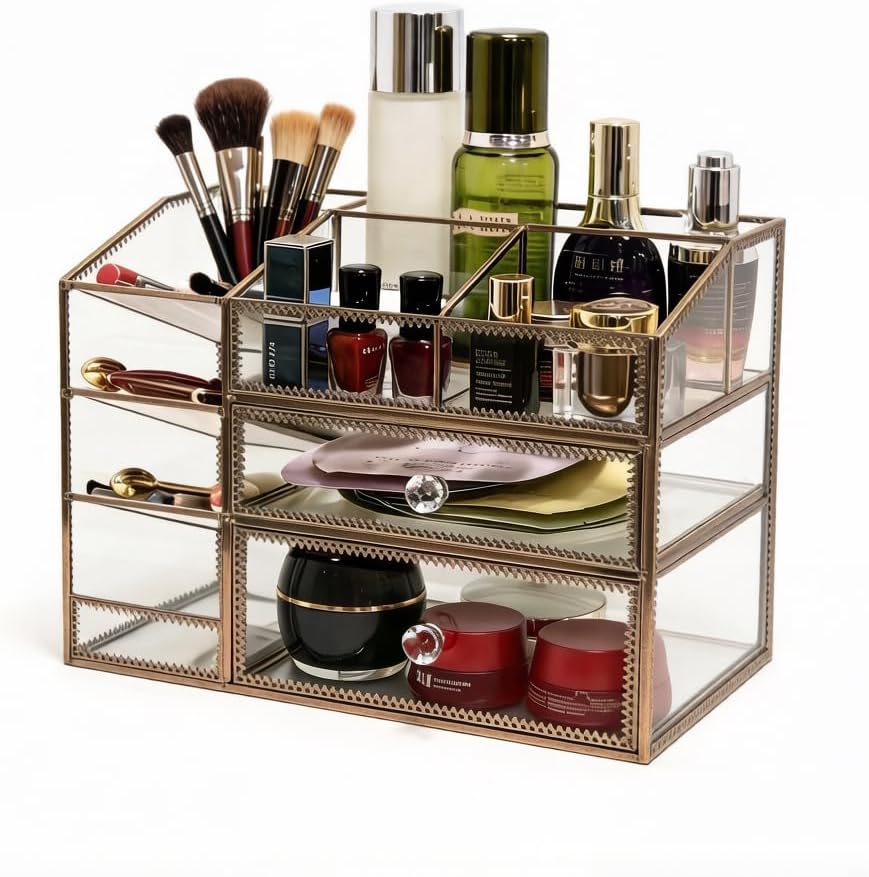 Tired of digging through messy makeup piles? Our Gold Trim Glass Makeup Organizer is the ultimate solution for beauty lovers who crave order and elegance. ✅ Crafted for Sophistication The mirrored metal frame + crystal-clear glass layers don’t just organize—they elevate. Watch as your vanity glows with soft reflections, turning everyday storage into a statement piece. ✅ Smart Storage for Every Beauty Essential Top Open Shelf: Display your favorite perfume bottles or skincare serums (fits up to 15cm tall). Middle Drawer: Conceal lipsticks, eyeshadow palettes, or jewelry—dust-free & organized. Bottom Open Shelf: Store bulkier items like toner, lotion, or makeup brush sets. Side Compartments: Perfect for slim lipsticks, nail polishes, or eyeliner pencils. ✅ Built to Last, Easy to Love Made of durable glass (resists scratches) and rust-proof metal (gold-plated finish won’t fade). Wipe clean with a damp cloth—no maintenance hassle. ✅ Thoughtful Gift Packaging Arrives in a sleek gift box, ready to delight. Whether it’s a birthday, Christmas, or “just because,” this organizer says “I care about your style.” Specifications Material: Tempered Glass + Metal (Gold/Silver Trim)