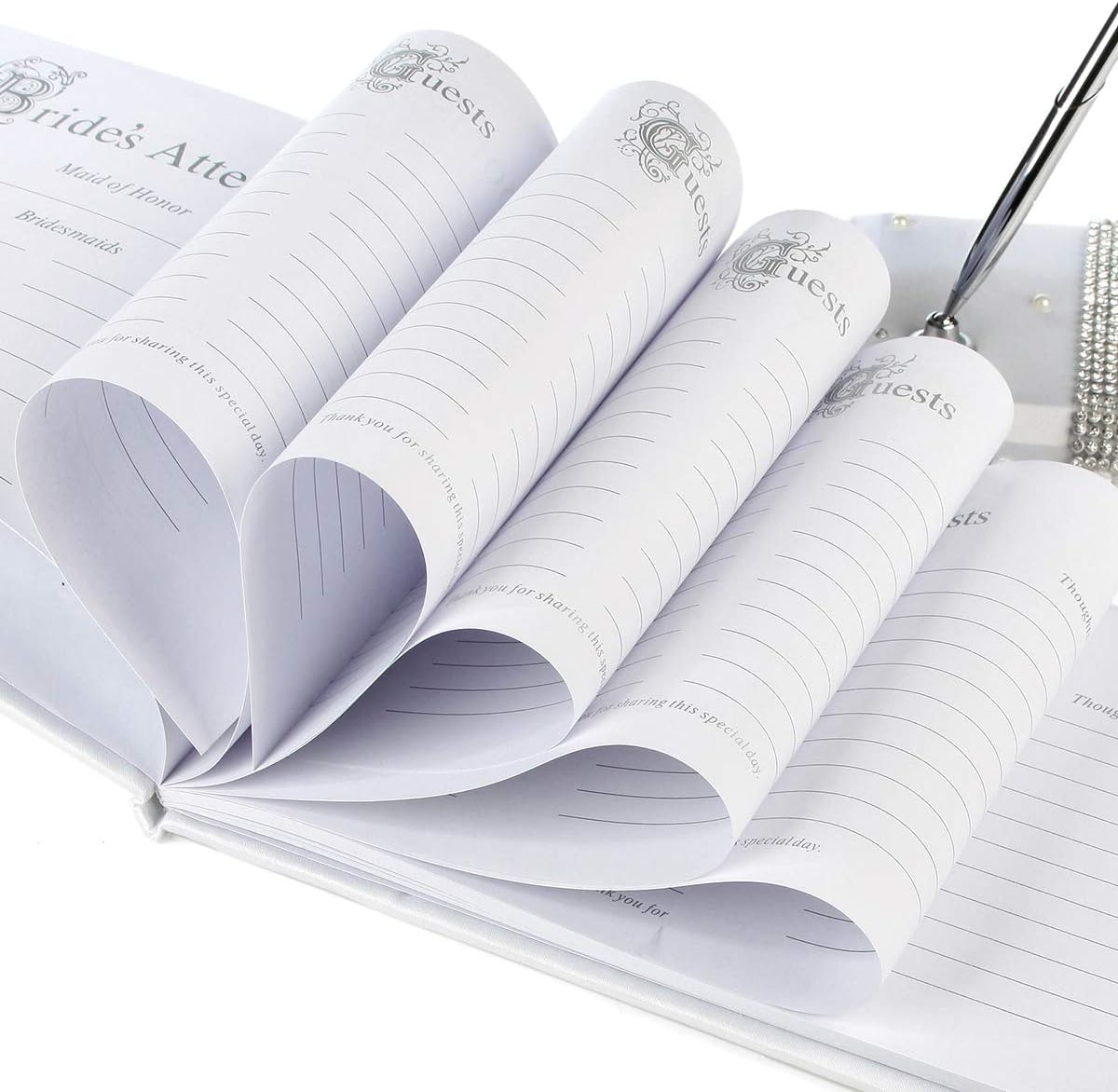 KateMelon Rhinestone Row Wedding Guest Book and Pen Set. This 9.6" x 6.3" guest book holds 70 pages for a total of 500 signatures. 1 page is for the bride and groom name. 1 page is for the Bride's family. 1 page is for the Groom's family. 1 page is for the Maid of Honour, Bridesmaids and Flower girl. 1 page is for the Best Man, Groomsmen and the Ring Bearer. The following 65 pages are for the guest names and their "thoughts" (11 lines per page). Guest book size: 9 3/5" x 6 1/3" (24.5 * 16 cm); Pen Holder Size: 3 1/2" × 3 1/2" × 3/4" (9 x 9 x 2 cm). Color: White. The guest pen is a ballpoint pen with black ink