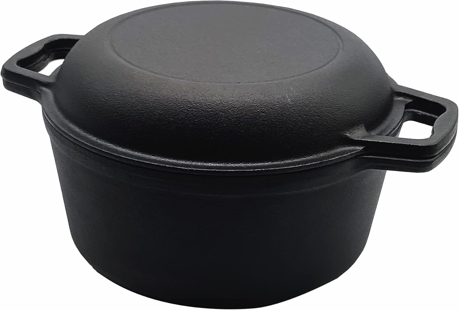 SHYIS 2-In-1 Cast Iron Dutch OvenFeatures and advantages► 5 QT Seasoned Cast Iron Double Dutch oven: Designed with a perfectly sized 10.6 inch wide diameter allowing an ample cooking space.Suitable for different scenarios and can meet the needs of large families.► Healthy & durable cast iron cookware: This double cast iron set is made of high-quality cast iron, more sturdy than ordinary cooking, safe to use and bulit to last. Cast iron gets more used, the more iron will be released, which is more beneficial to health.► Easy to clean & maintain: Before first use: rinse (without soap) the cookware in hot water then dry completely, apply a light coat of vegetable oil onto the inside surface before cooking. Clean after use: wash with brush and hot water, and dry with a towel while still warm, reapply another light coat of oil.► Multi Purpose cookware 2-In-1 cast iron dutch oven use to sear, simmer, bake, broil, braise, roast, fry, or grill meats, vegetables and more. Suitable for indoor and outdoor cooking at home or on vacation!If for any reason you are not satisfied, please send an email to us. We will reply within 24 hours
