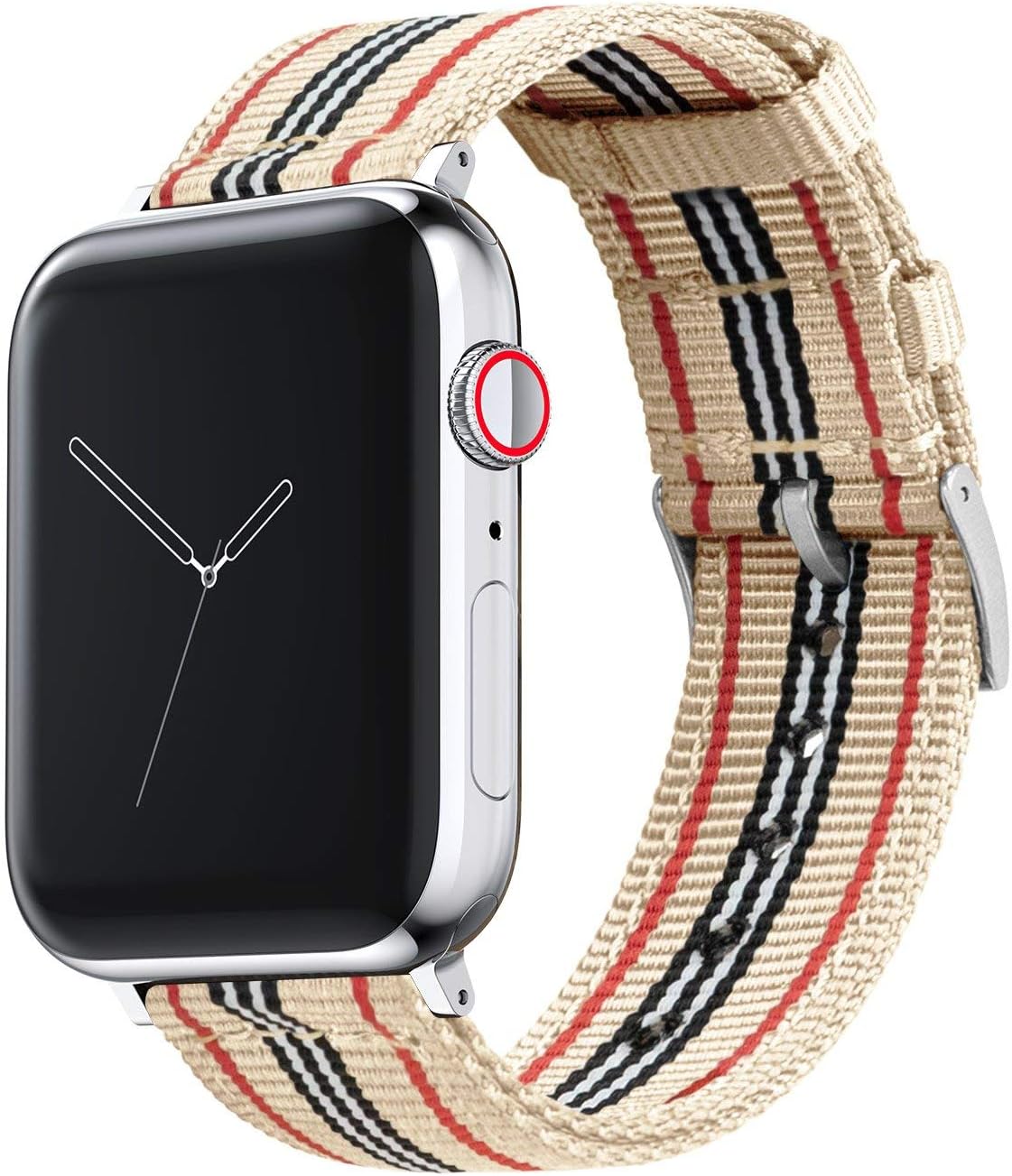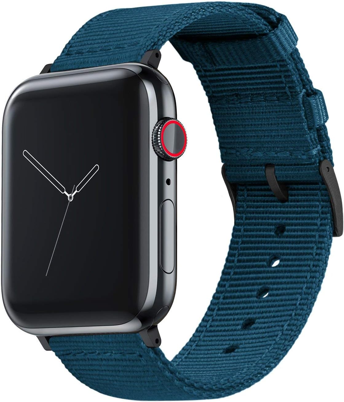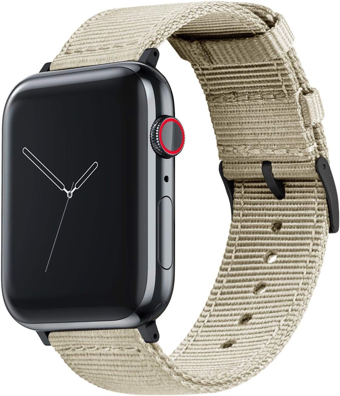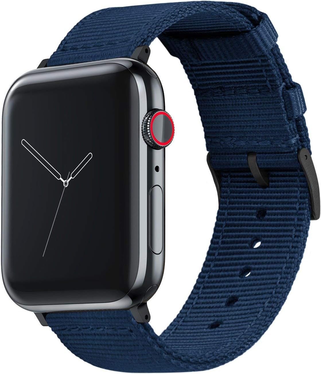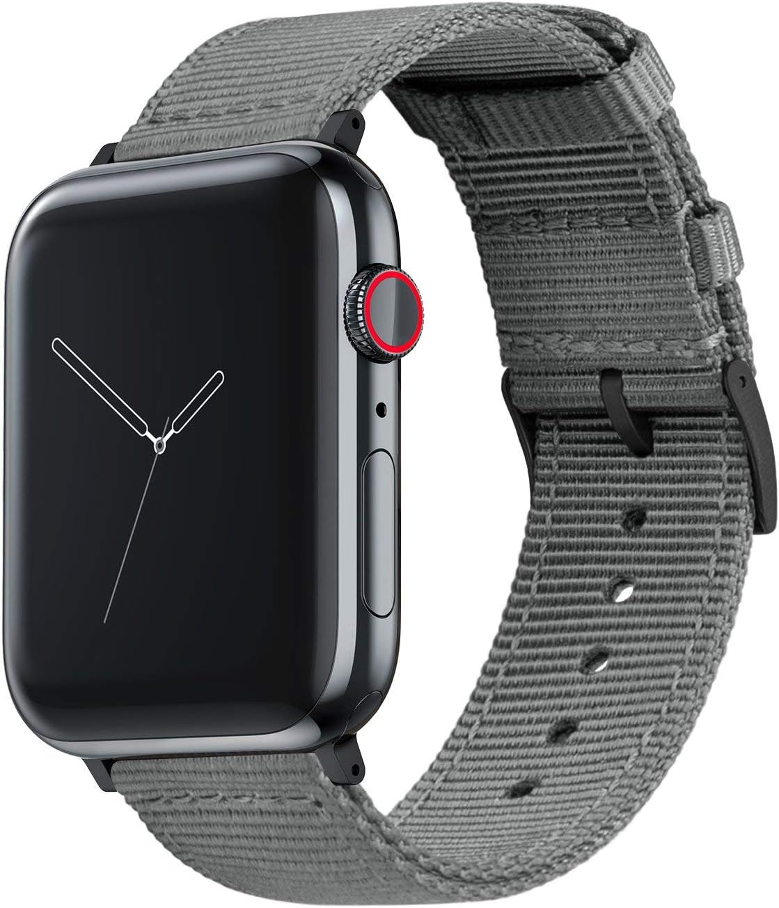 Material: Ballistic nylon Hardware: Brushed 316L stainless steel or Black PVD, Solid Tang Our Two-piece Military Style Compatible with Apple Watch bands are sure to add character and comfort to any Apple Watch. Our nylon straps are water-resistant, colorfast, and feature two nylon keeper loops for a more comfortable fit. Quick-release spring bar mechanism allows for the use of multiple bands across a single set of Apple Watch Adapters. Adapters accommodate any 22mm band.Please be aware that due to the sturdy dual-layer construction, our two-piece Military Style straps do have a stiffer feel that softens up over time. Compatible with Apple Watch Series 1, 2, 3, 4, 5, 6, 7, 8, SE, & Ultra Two Sizes Available: Fits wrists 5" to 8" Width: 22mm At BARTON Watch Bands, we obsess over designing quality products that meet the highest standard for fashion, function and fit. Based in the heart of Austin, Texas, BARTON was founded in the wake of many years of frustration with poorly designed, dysfunctional, low-quality watch bands. All of our bands are designed to be swapped in and out in a few seconds and without tools! Time to "Switch it Up" and let the fun begin....trust us, it's pretty awesome!