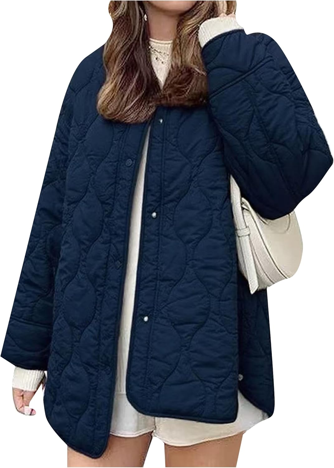 Women Quilted Jacket Padded Oversized Long Sleeve Coat Lightweight Warm Puffer Jackets with Pocket Material: Women's jacket is made of lightweight,breathable and skin-friendly fabric,soft and comfortable to wear all day. Features: Long sleeve,crew neck,collarless,snap front closure,two side pockets,side split,solid color,loose fit quilted jacket. Size: S Bust 41.3 inch= 105.0 cm,Sleeve 22.4 inch= 57.0 cm,Length 17.7 inch= 45.0 cm,Shoulder 28.0 inch= 71.0 cm M Bust 43.3 inch= 110.0 cm,Sleeve 22.8 inch= 58.0 cm,Length 18.1 inch= 46.0 cm,Shoulder 28.3 inch= 72.0 cm L Bust 45.7 inch= 116.0 cm,Sleeve 23.2 inch= 59.0 cm,Length 18.7 inch= 47.5 cm,Shoulder 28.9 inch= 73.5 cm XL Bust 48.0 inch= 122.0 cm,Sleeve 23.6 inch= 60.0 cm,Length 19.5 inch= 49.5 cm,Shoulder 29.5 inch= 75.0 cm 2XL Bust 50.4 inch= 128.0 cm,Sleeve 24.2 inch= 61.5 cm,Length 20.3 inch= 51.5 cm,Shoulder 30.3 inch= 77.0 cm NOTE: 1.The actual colour may differ from the picture due to computer settings. 2.Please allow 1 to 2 cm deviation due to manual measurement.