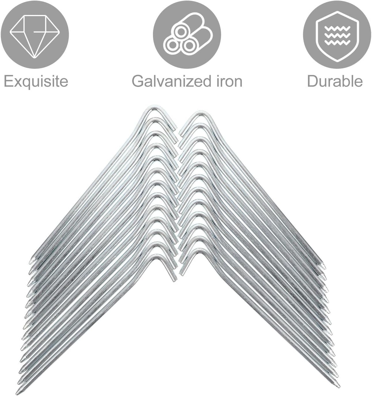Package Include 25 stakes Characteristics -Size:18.00X3.00X0.50cm/7.07X1.18X0.20in -Product Info:Tent floor nails -Color:Silver -Material:Galvanized iron - Lightweight yet heavy-duty strength while anchored and not rust, very practical to use heavy duty camping pegs. - The smooth design of the tip, not easy to hurt hands. Easy to pull out design, convenient for next use tent stakes for camping. - Using galvanized iron material of and fine craftsmanship, strong and durable for long serving life. - Great for beach, , tents, gazebos, tarps, groundsheets and gardening galvanized non-rust ground stakes. - The tent stake can secure your tent and hold it in place against winds and storms stakes for tents heavy duty.Goods Informationtent stakes heavy duty metal This stake can be used for many occasions, and can be used as tent pile, camping pile, tarpaulin hook, inflatable pile, etc.tent pegs This is a stake for tent, specially designed into simple shaped, which aims to fix the tent well and this stake can be inserted into the ground easily
