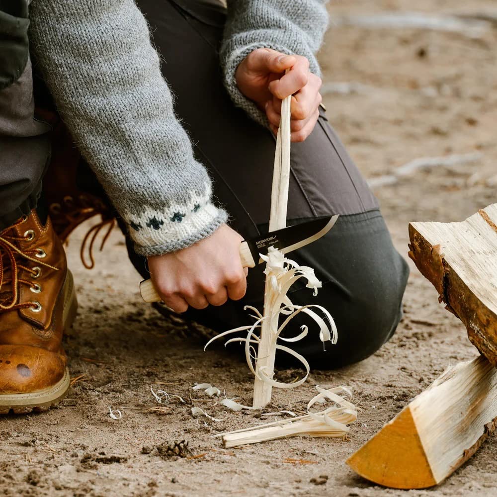 A hiker's knife designed to be close at hand, the Finn fits perfectly in your pocket and is ready to take on your next excursion. The ergonomic handle and finger guard are made of carefully selected ash wood from European FSC certified forests, and the 2.0 mm thick recycled Swedish stainless steel blade provides both strength and stability in every cut. A beautifully balanced contrast between the bright ash wood and the shiny edge of the blade is made possible by the black PC coating. Keep the sharp edge of the knife protected with a vegetable tanned leather sheath. The Finn is compatible with the Morakniv Dangler 10, allowing you to extend the distance between the knife sheath and your belt.