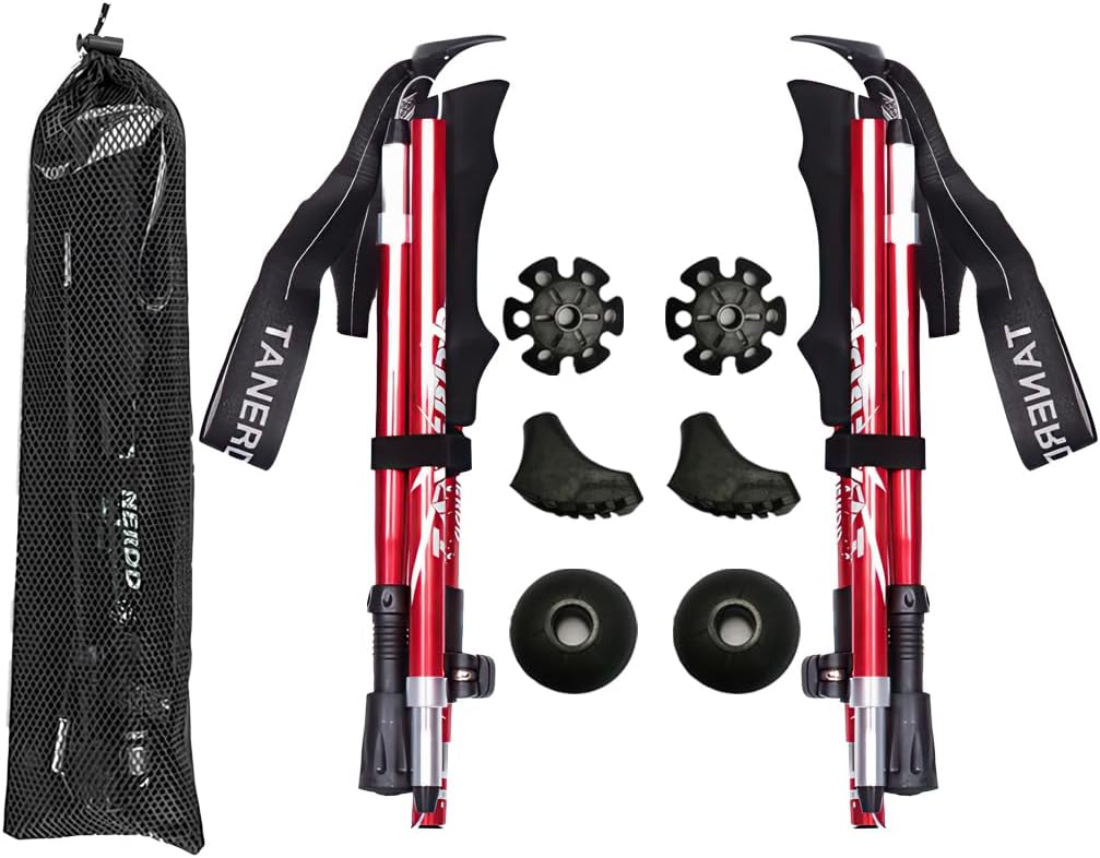 This 2-pack folding trekking poles set is built for stability, comfort, and portability. Made of reinforced aluminum alloy, lightweight at only 9.5oz each, and foldable to 14.2 inches for easy carrying. Equipped with an ergonomic EVA foam handle and adjustable length from 43.3–51.2 inches to fit all users. Includes full terrain accessories and a storage bag, making it ideal for hiking, trekking, camping, or daily walking support.