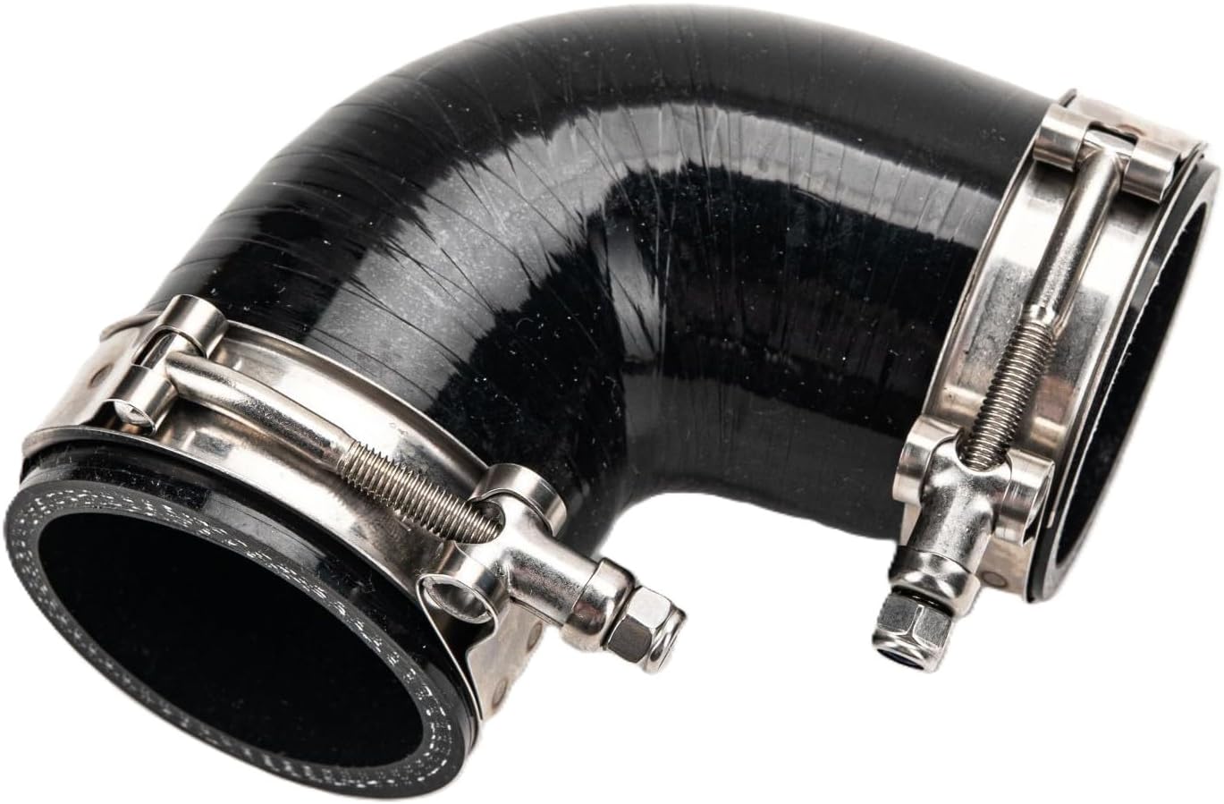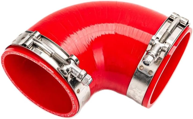 The Silicone 90° Elbow Intake Hose is a genuine 4-ply construction (5 silicone layers + 4 reinforcement layers) designed to join intake piping to the throttle body, air metering assembly, intercooler, BOV pipe, or turbo inlet/outlet. It includes two stainless steel T-bolt clamps for a tight, leak-resistant seal. Rated for -40° to 392°F with 200 PSI burst and 50 PSI working, the 4–5 mm wall provides stable connections under boost. The hose can be trimmed with a razor for custom fitment and is compatible with antifreeze/coolant. Suitable for turbo, supercharged, and naturally aspirated setups in cars, trucks, RVs, and boats.