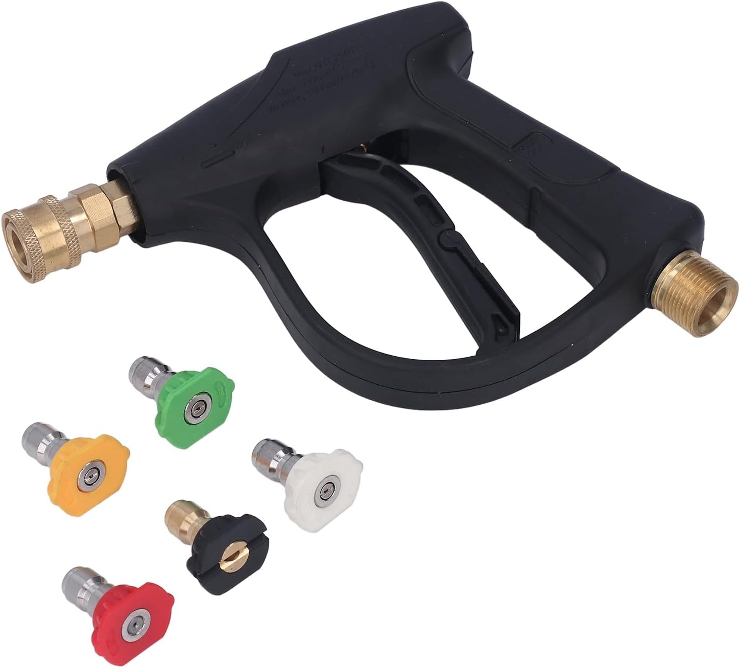 Specification:Item Type: Car Cleaning GunMaterial: Plastic + BrassCapacity: 1LMaximum Pressure: 300BAR, working 150BARMaximum Temperature: 60℃, 140℉Nozzle Details:0 degree (red, stainless steel, concentrated pencil jet) high pressure nozzle15 degree (yellow, stainless steel, high performance) high pressure decontamination25 degrees (green, stainless steel, multi purpose) low pressure brick cleaning, etc.40 degrees (white, stainless steel, sensitive surfaces) common uses such as car cleaning, etc.Black (foam)Package List:1 x Car Cleaning Gun5 x Nozzles Note:Use only high pressure water, regular garden water pressure will not work.