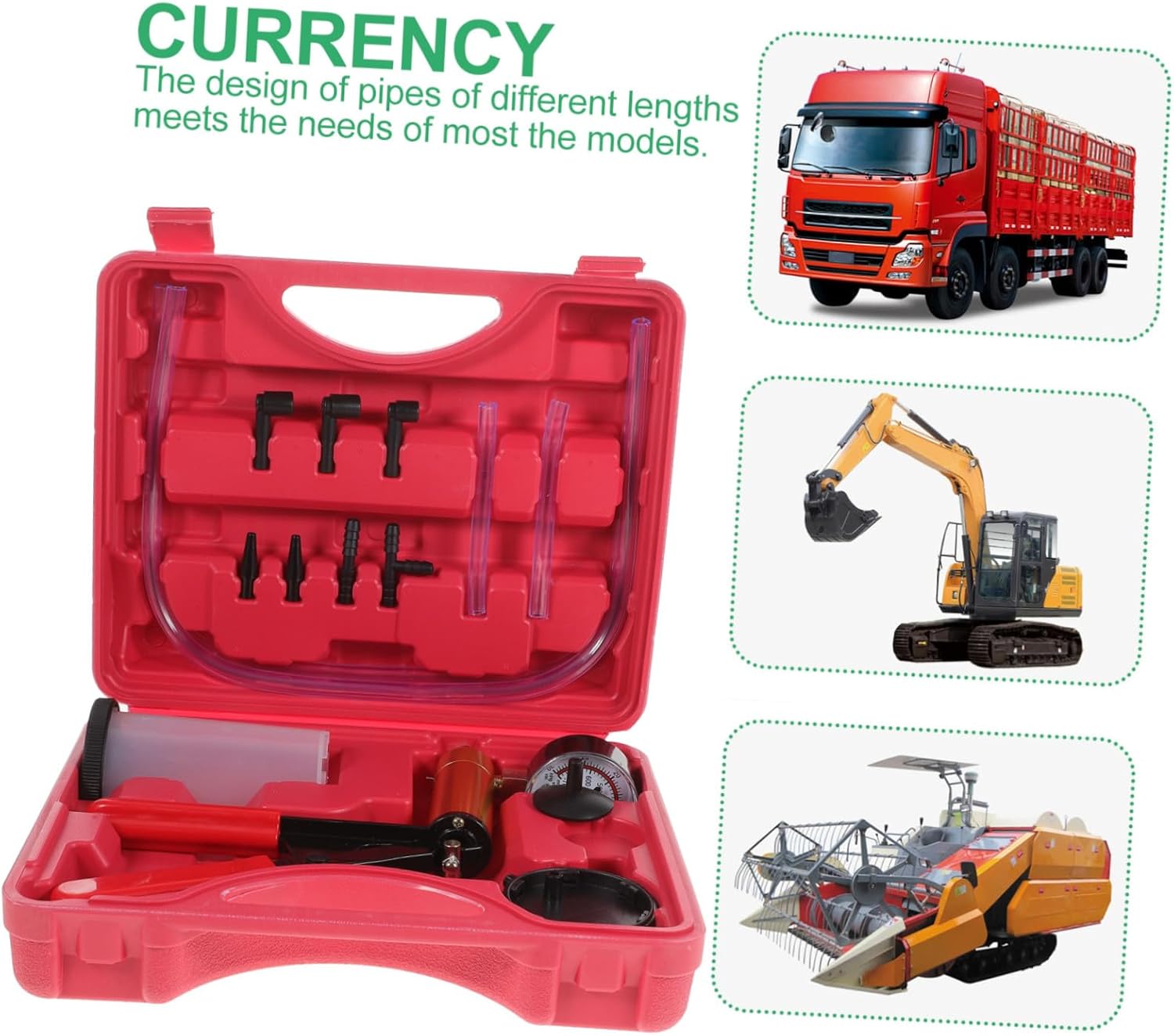 Package List 1 x manual vacuum pump 1 x measuring cup with lid 9 x adapters 2 x short transparent tubes 2 x long transparent tubes Features -Color: Assorted Brake Bleeding Kit. -Product Info:Manual vacuum pump -Material: ABS, rubber, aluminum alloy Car Manual Vacuum Kit. -Size: About 24.00X18.50X3.80cm/9.43X7.27X1.49in Car Brake Bleeder Tools. - The sturdy handle is equipped with a brake fluid collector with a variety of connectors to meet different needs Vacuum Pump Test Tool. - The hose is designed with a release valves that produces a negative pressure Brake Bleeder Kit. - The design of of different lengths meets the needs of most the models Manual Vacuum Kit. - The product package has a complete range of products to meet the needs of auto parts maintenance Car Vacuum Pump Tool. - Replaceable cylinder ring, rubber piston ring and valves Vacuum Pump Tuner Tool.Goods InformationCar Brake Bleeder Tools The hand operated pump pulls the fluid through the bleed nipples, eliminating need to use the brake lever or pedal.Vacuum Pump Tuner Tool Comprehensive workshop vacuum pump kit includes reservoir and adapter for brake and fuel line bleeding