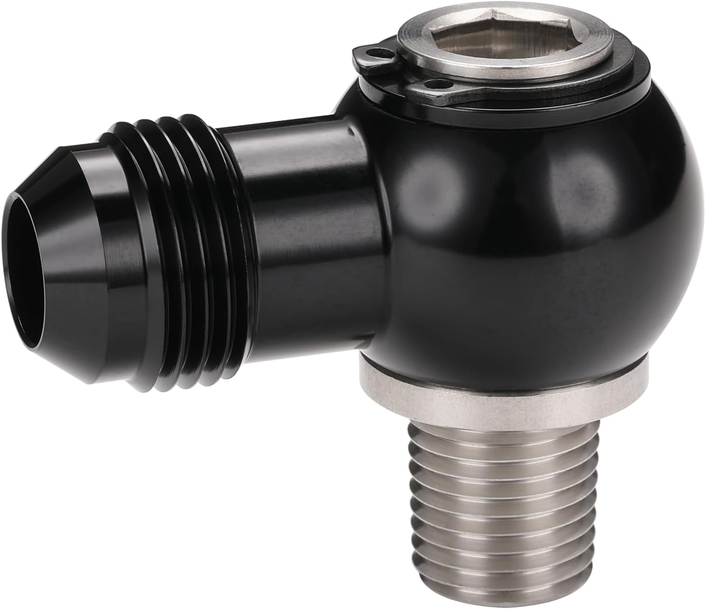 Specifications:Material: 6061 T6 billet aluminum for the banjo and 304 stainless steel for the boltSize: Banjo thread: AN8 (3/4x16 UNF) male flare. Bolt thread: 3/8 NPT. Banjo thickness: 24.5mmSurface Treatment: Anodized blackFeatures: - This assembly is the perfect low-profile solution where standard 90-degree AN fittings are too bulky. It seamlessly connects a 3/8 NPT port to a -8 AN line at a 90-degree angle, routing fuel or oil efficiently in tight spaces- The banjo can be rotated a full 360 degrees even after installation. This allows for perfect alignment of your AN hose, eliminating stress on the line and ensuring optimal flow for maximum performance- Perfect for use with turbo oil drain lines, fuel pressure regulators, or any other application that requires an NPT thread port to AN 90-degree connection; Safe for use with all types of fuels, including alcoholic fuels- Safe for use with all types of fuels, including alcoholic fuelsNotice: Professional installation is highly recommended! (No instructions included)