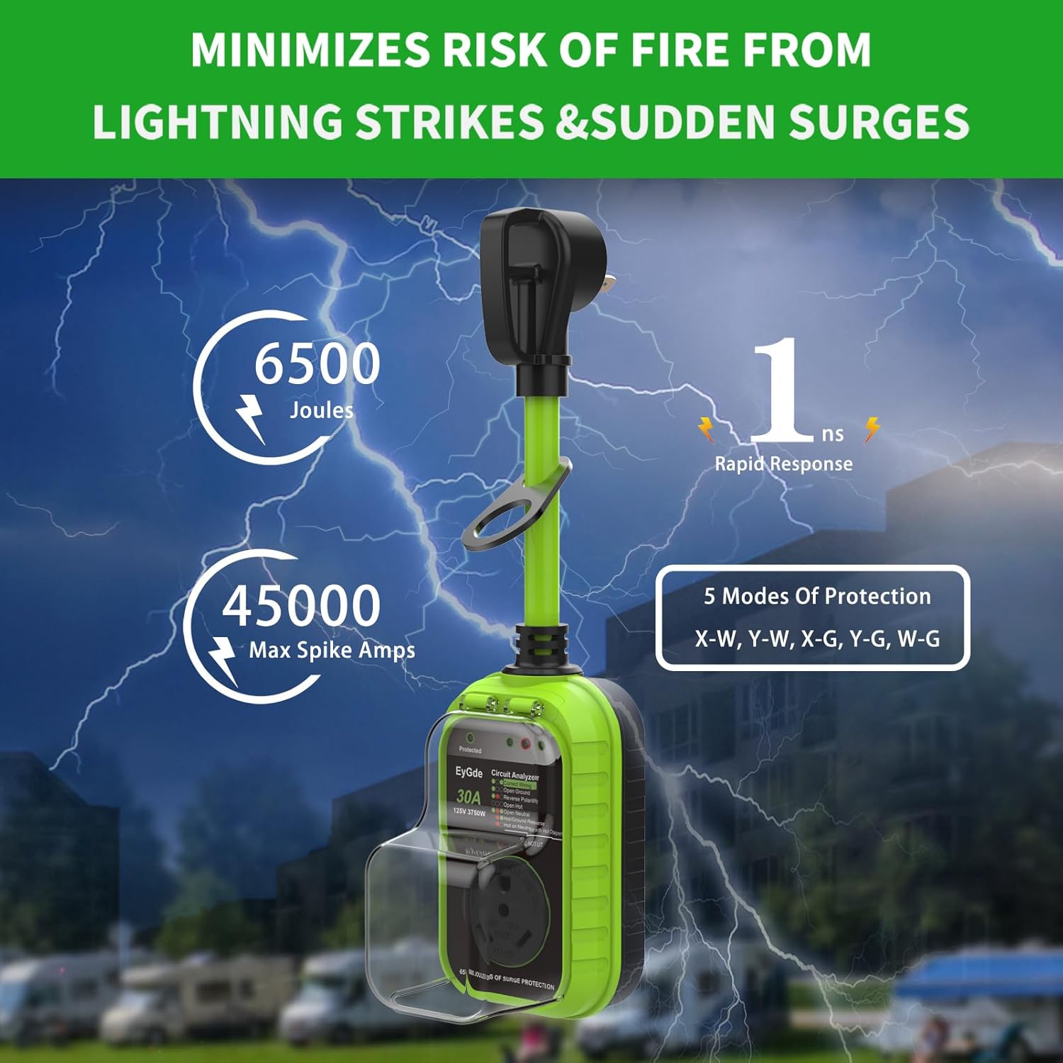 EyGde 30 Amp to 15 Amp 110V RV Adapter with Surge Protector, Patented 4200J 15 Amp Male to 30 Amp with Locking Connector, Circuit Analyzer Power Guard with Surge Protection 16.3" for Camper Trailer. RV Surge Protector 30 Amp, RV Circuit Analyzer with Waterproof Cover, RV Accessories Power Voltage Protection Guard for Camper Travel Trailers