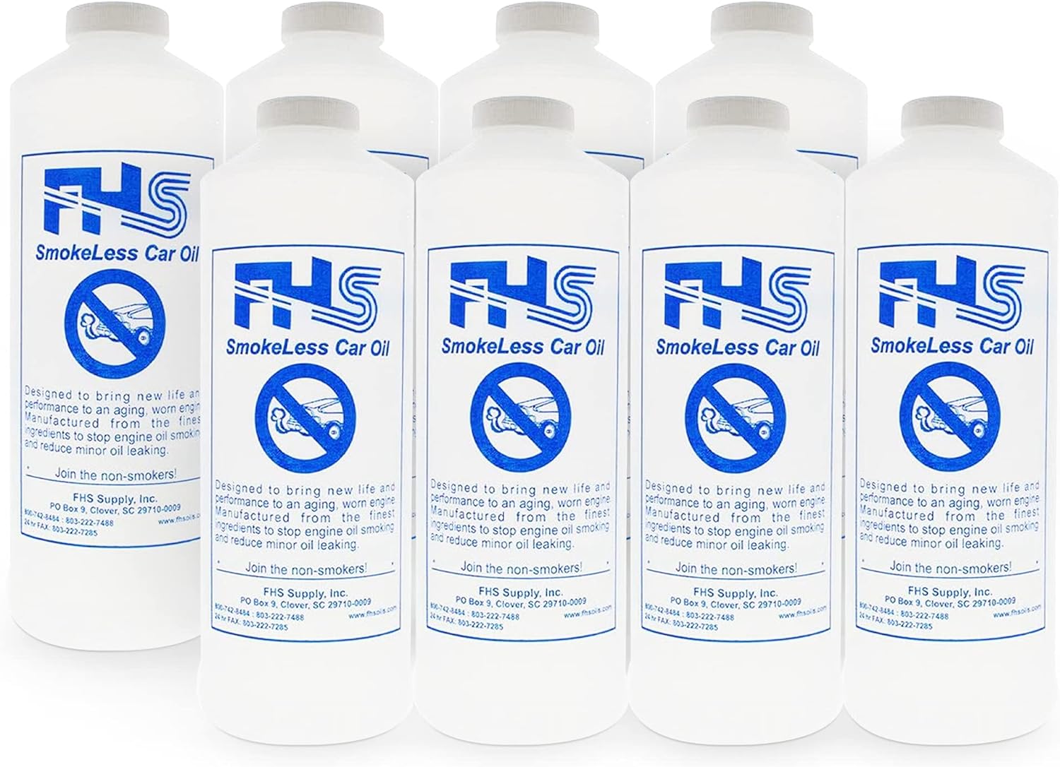 FHS Smokeless Ultra Pure Oil (20 Quarts): FHS stop-smoke oil is an environment-conscious and economical solution to automotive air pollution. This ultra clean engine oil does not contain other oils' burnable, smog-producing impurities. Our smokeless oil is a pure, high-quality smokeless synthetic gear oil, derived from our FHS no-smog oil, that will protect your engine like no other. A simple smokeless synthetic engine oil change costs much less than the major work required to fix a mechanical problem. This smogless oil is simply a better oil. Our smokeless synthetic diesel oil works, guaranteed! FHS Supply Co have been making specialty oils/racing oils since 1969! Our premium synthetic oil has a special sealing/anti-wear agent that covers cracks and prevents wear better than other types of clean emissions oil. This smokeless synthetic oil for car’s sealing/anti-wear agent was originally designed for racing engines, and therefore our low emissions oil gives incredible protection without thickening, gumming, or slowing the engine like other products. Racers on the ragged edge need the fastest oil with the best protection. This same anti-wear agent greatly extends the mileage possible on the same oil change. That clear oil can easily go 6000+ miles per change. FHS SmokeLess will work in a turbo. However, it is less likely to stop smoking in cars with a turbo. --- Smokeless Ultra Synthetic Oil Ingredients: FHS Proprietary Oil (Non-Hazardous Synthetic Oil), Phosphate Oil Blend, and Tritolyl phosphate. --- Note: Smokeless is oil, not an additive. If you mix it with other oils you will get smoke. You also need to change the oil filter, as old oil can get trapped in the filter. About Us: FHS Supply Co has been specializing in cutting-edge racing oils for over 50 years.