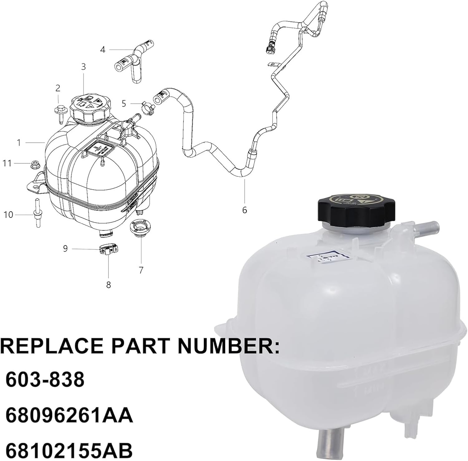 Upgraded Coolant Expansion Visible Markings Drain Port Easy Maintenance 2015 2018 Models Features: Engineered with 15% increased capacity and 2.5 pressure resistance, this OEM grade coolant reservoir ensures optimal thermal management for 2015 2018 / models ( Part # 68102155AB), effectively overheating during extended drives Crafted from high strength polymer component with 40°C to 120°C temperature tolerance, the reservoir features bubble reduction fluid channels, visible indicators, and engineered drainage ports for maintenance efficiency Ideal for owners seeking cooling systems upgrades, professional mechanics requiring spec replacements ( Interchange # 68096261AA), and enthusiasts prioritizing components over traditional metal tanks Maintains stable coolant circulation during commutes, highway journeys, and extreme weather conditions while accommodating modern engine bay configurations through its compact, design Rigorously tested to meet OEM standards, this direct fit recovery delivers factory with enhanced fluid capacity, ensuring seamless integration with your vehicle ' s existing cooling systems components Specifications: Type: Coolant reservoir Part number: 68102155AB 603-838 68102155AC 68102155AD 68249136AA 68096261AA 68442532AA component: Color: As shown in the picture Applicable models: Suitable for 2014-2018, 2015-2017 Package Includes: 1pc Coolant Note: Please allow 1-2cm errors due to manual measurement Due to difference between different monitors, the picture may not reflect the item actual color