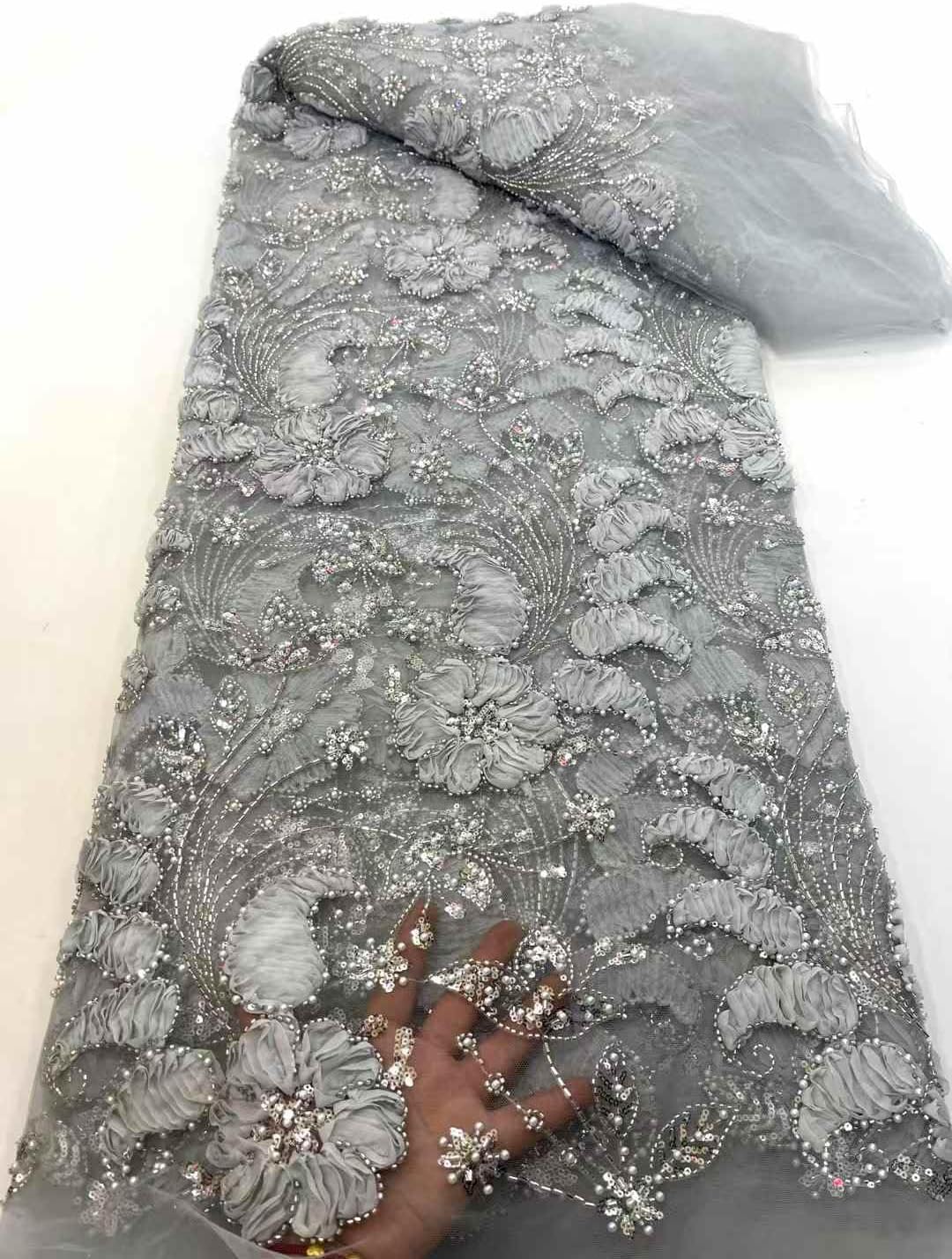 Elevate your fashion creations with our exquisite 3D Embroidered Tulle Lace Fabric, the perfect combination of comfort and elegance for sophisticated designs. This premium fabric features delicate pearl beads and shimmering sequins meticulously hand-embroidered onto soft stretch net fabric, creating a luxurious dimensional effect that adds glamour to any garment. The fabric's comfortable stretch quality ensures a perfect fit while maintaining its elegant drape, making it ideal for wedding dresses, bridal gowns, and evening dresses. The intricate 3D embroidery enhances the fabric's fashionable appeal, adding texture and sophistication to your designs. Crafted from high-quality materials, this tulle lace fabric is a little heavy weight and durable, offering both comfort and style. The pearl beads and sequins are securely attached to prevent shedding, ensuring long-lasting beauty. Its soft texture feels gentle against the skin, making it perfect for special occasion wear. Key Features: 1. Premium 3D embroidered tulle lace with pearl beads and sequins for a luxurious look 2. Soft stretch net fabric ensures comfort and a perfect fit 3. Elegant and fashionable design ideal for bridal and evening wear 4. Lightweight yet durable construction for long-lasting use 5. Versatile fabric suitable for dresses, veils, and decorative accents