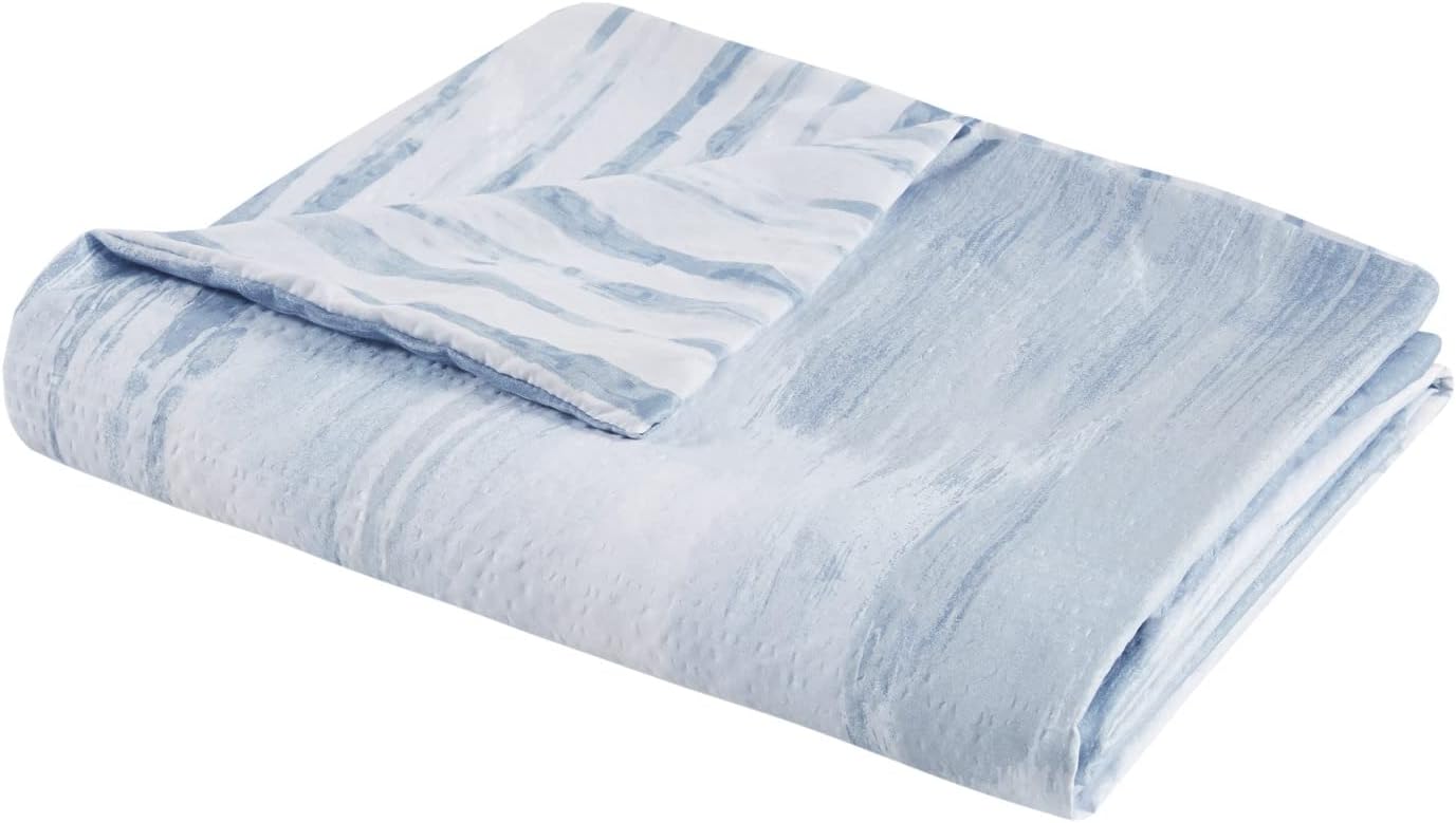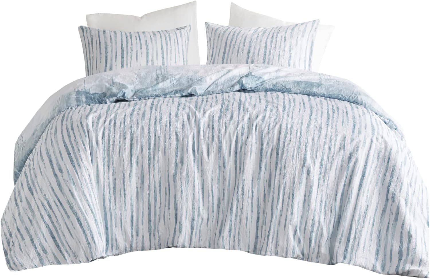 The N Natori Brush Stroke 3 Piece Reversible Seersucker Duvet Cover Mini Set elevates your bedroom with its simple and elegant lounge style. This reversible duvet cover flaunts a soft blue, broad brushstroke print on seersucker heatset fabric to create a luxurious lustrous look. The reverse features a narrow brushstroke print to contrast the design on the face, giving you two artistic looks for the price of one. Matching shams repeat the patterns seen on the comforter to complete the seersucker bedding set. Oversized for better coverage on high depth mattresses, this reversible duvet cover set brings a casual elegance to beautify your bedroom décor. A button closure at the foot end secures a padded insert within the duvet cover and inside corner ties prevent it from shifting (insert is NOT included). Machine washable for easy care.
