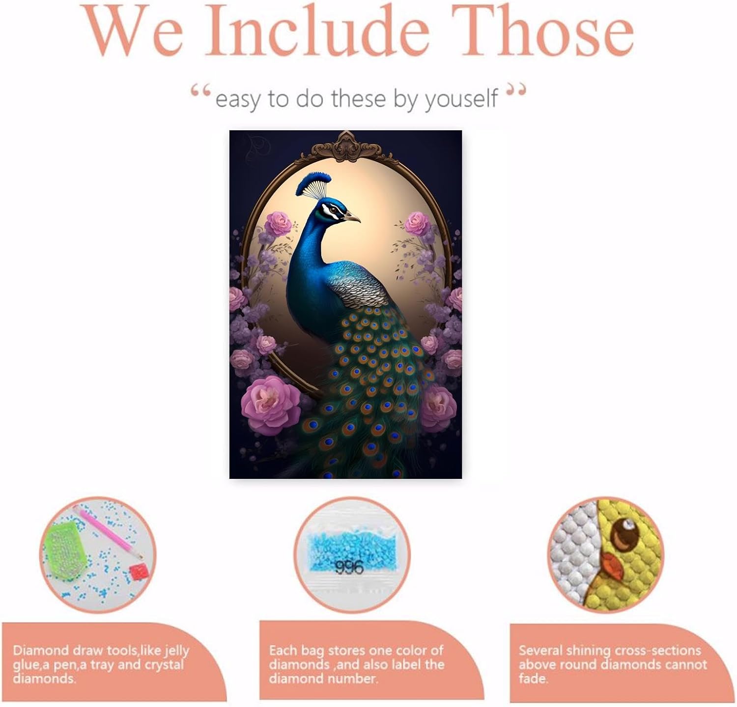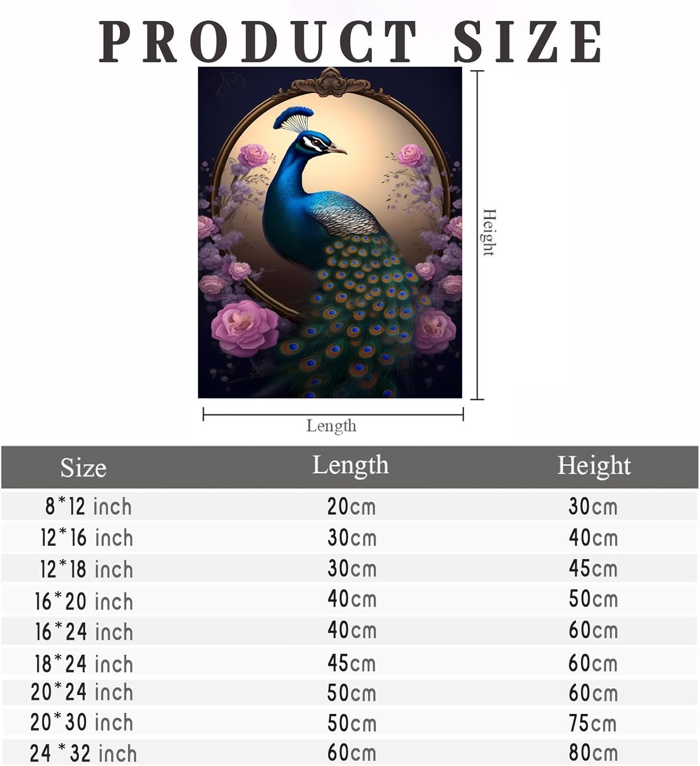 About Diamond PaintingMaterial: Full Round Diamonds + CanvasColour: Sparkling PeacockCanvas Size: 20x30 Inch/50x75 cmName: Sparkling Peacock Diamond PaintingApplication: Framed Hanging, Decorating Bedroom/Living Room/Walls, As A Gift. Cultivate The Concentration Of Doing Things, Get A Sense Of Satisfaction, Enhance The Relationship Between The Two Parties Working Together.How To Make Diamond Painting?1. Learn To Read The Canvas. The Canvas Is Labelled With Numbers. Each Number Corresponds To A Diamond Colour. Find The Diamond In The Numbered List According To The Corresponding Number.2. The Canvas Is Covered With A Protective Plastic Film. We Recommend That You Do Not Remove The Entire Sheet Of Plastic Film At Once. Instead, Start At The Bottom And Work Your Way Up, Slowly Removing The Film.3. Place The Desired Diamonds In The Tray. It Is Recommended That You Use One Colour At A Time. Gently Shake The Tray To Place The Diamonds Flat Side Down.4. Dip The Tip Of The Applicator Into The Gel. The Gel Will Allow You To Adhere The Diamonds.5. Gently Press The Tip Of The Applicator To The Rounded Side Of The Diamond.6. Peel Back The Plastic Film To Reveal The Area You Are Working On, Then Carefully Place The Diamond Into The Corresponding Numbered Box.Repeat Steps 4-6 Until The Design Is Complete.Caution:This Is A DIY Diamond Painting, Not A Finished Picture, You Need To Finish It By Yourself. All Of Our Diamond Paintings Are Packages, Guests Need To Make Their Own Handmade, We Provide The Necessary Materials And Tools.