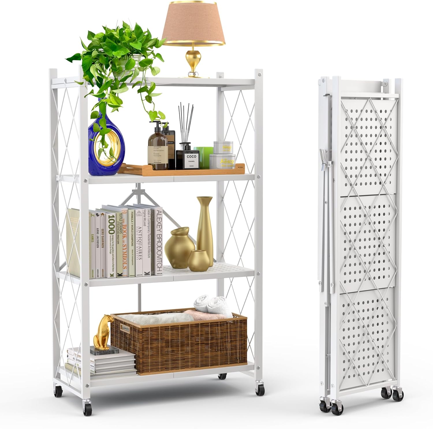 5-Tier Foldable Storage Shelf with Wheels | Metal Rack Collapsible Shelving Display | Rolling Cart for Books Kitchen Storage Shelves | Pantry & Closet Organizer | Office Room Decor