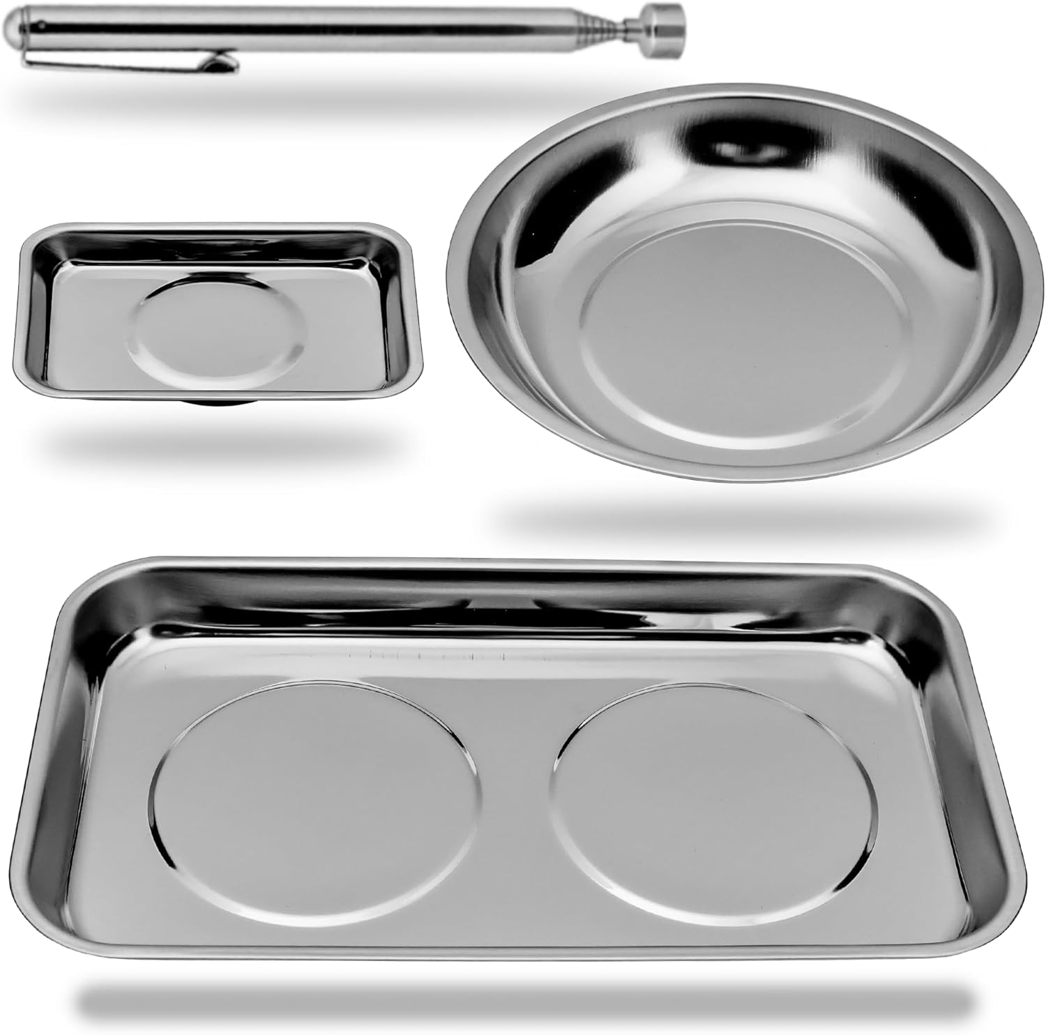 Keep your workspace organized and efficient with the HORUSDY 3-Piece Round Magnetic Parts Tray Set, the perfect solution for storing small parts, bolts, screws, and nuts during maintenance or assembly work. Made from premium stainless steel, these trays deliver outstanding durability and rust resistance, ensuring long-lasting performance in both home garages and professional workshops. This set includes three convenient sizes—3", 4", and 6"—to accommodate a wide range of fasteners and components. The trays can nest together for easy storage and transport, while their compact design saves valuable bench space. Whether you’re repairing vehicles, assembling furniture, or working on home improvement projects, these trays keep your essentials within reach and off the floor. Each tray features an ultra-strong magnetic base that securely holds metal parts even when used vertically, sideways, or upside down. The base is coated with a protective rubber layer that prevents scratches on polished or painted surfaces, making it safe to use on toolboxes, lifts, or metal cabinets. With HORUSDY’s reliable craftsmanship, this magnetic tray set offers a clean, organized, and damage-free way to handle small metal parts. Simple, durable, and built for everyday use—it’s a must-have addition to any mechanic’s or DIYer’s toolkit.