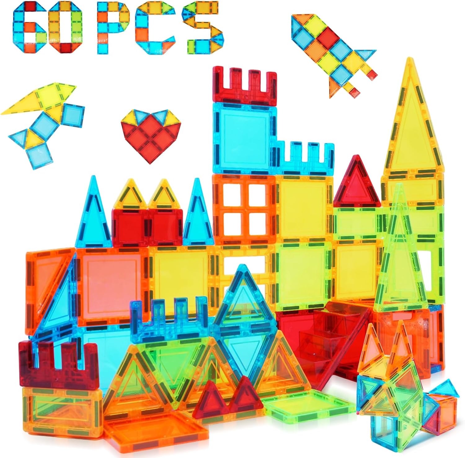 UNIQUE EDUCATIONAL AND ENTERTAINMENT VALUE - Magnetic Tiles Toys Represent A Valuable Addition To Any Household Fine Motor Skills: Manipulating the magnetic blocks helps improve fine motor skills and hand-eye coordination. Boys and girls practice precise movements and control as they connect and align the piecesSTEM Learning: Magnet tiles for kids ages 1-3 3-5 4-8 introduce kids to basic principles of science, technology, engineering, and mathematics (STEM). Building with these magnetic tiles for kids ages 3-5 4-8 toys helps them understand concepts like magnetism, balance, and symmetryQuality Time: magnetic building tiles provide an opportunity for parents and children to spend quality time together. Building projects can become a bonding activity that strengthens family relationshipsStress Relief: Engaging in creative play can be a stress reliever for both kids and parents. It provides a break from daily routines and allows for relaxation through playEasy Cleanup: Magnet blocks for kids toddlers ages 1-3 3-5 4-8 toys are easy to clean up and store. The pieces stick together, reducing clutter and making it simple to gather and put awayLongevity: With their resistant construction, magnetic toys for kids ages 3-5 4-8 are less likely to break, reducing the need for frequent replacements. They seamlessly combine education and entertainment, making them a worthwhile investment in a kid's development and family bonding