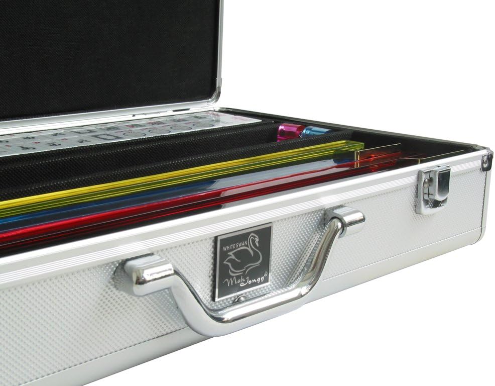 White Swan Mah Jongg sets are the highest quality American Mahjong sets available today. This luxurious product was designed by a team of Mah Jong players and advisors, and is crafted to the highest specifications. It is intended for the discerning Mahjongg player that wants to own the best!The design team incorporated noticeable upgrades from ordinary budget Mah Jongg sets. Most importantly, you will notice the absolutely perfect tiles that are the White Swan trademark. Large and smooth, these engraved melamine tiles feature crisp and clear characters with clearly recognizable red, green, and black colors. Absolute perfection!And it gets even better. You will also notice that these White Swan American Mah Jongg sets come with gorgeous color co-ordinated pusher arms, that are carefully stowed in their own compartment after game play. How nice is that?White Swan Mah Jongg sets come in an array of beautiful, high quality aluminum cases that feature reinforced ergonomic handles, extra strong latches and hinges, as well as beautifully accented corner protectors.Open the case and discover numerous other upgrades, such as the padded inside lid, perfect for keeping your tiles and other components in place during transport. The tile trays are strong, precisely sized and encased in non-woven fabric, ensuring that your tiles remain clean and organized at all times. Your brilliantly colored tile racks are machined perfectly and without any blemish.If you want to become the envy of your Mah Jongg group, go ahead and treat yourself to a White Swan American Mah Jongg set. Compliments are guaranteed!Additional Information:Closed Case Length: 20" Width: 11" Height: 4"; 166 Melamine White/Burgundy Tiles: Length: 1 3/16" Width: 7/8" Thick: 1/2"; 4 Mah Jong Racks: Length: 16" Width: 2 1/8" Height: 1"; 4 Acrylic Mah Jong Pushers: Length: 18"; 2 Spare Jokers, 4 Blank Tiles, Bettor, Rule Book, 100 Chips