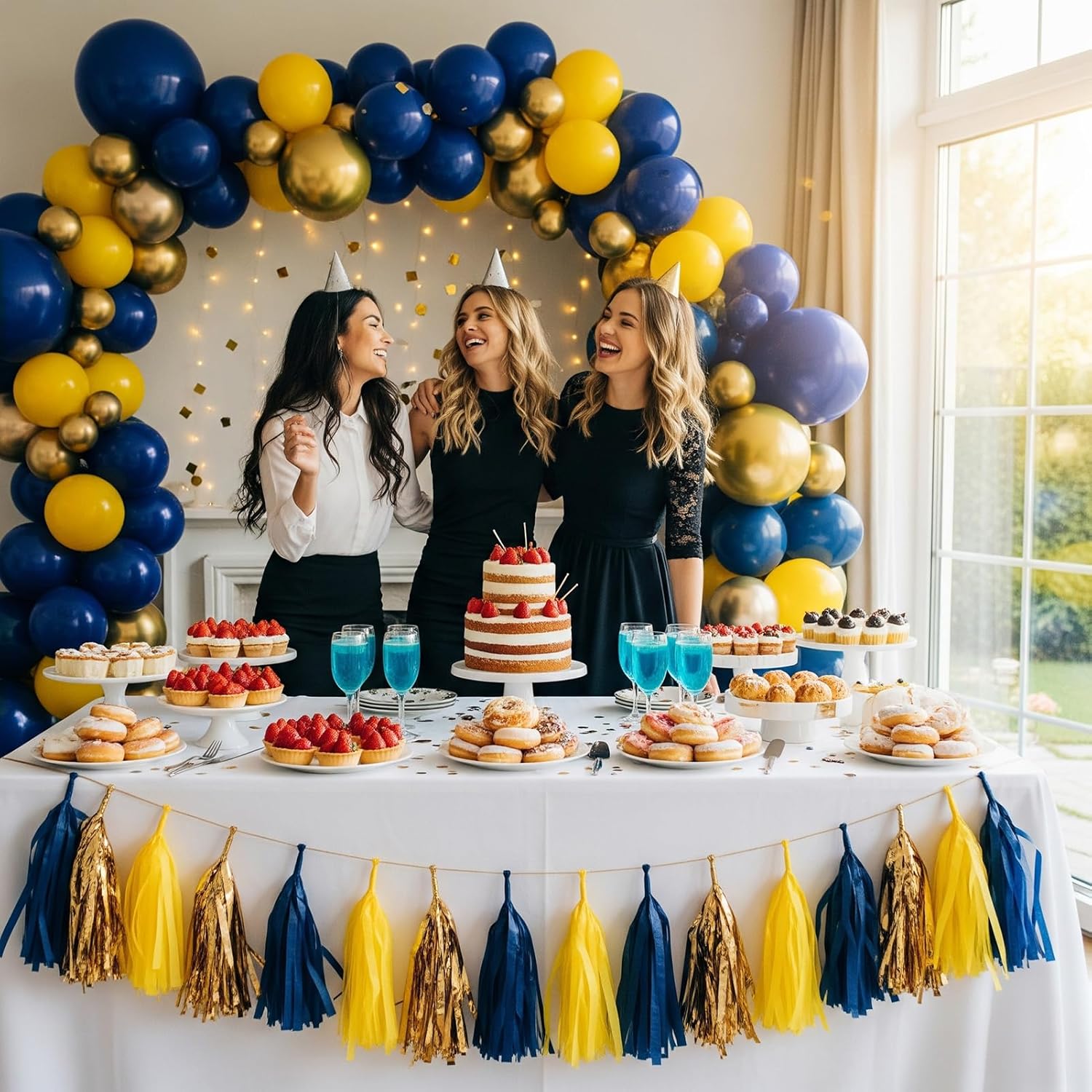 【Classic Navy Blue Balloon Decoration】Includes 137 different sizes of 5/10/12/18 inch balloons below. We used navy Blue , yellow and gold rubber balloons as our theme palette, adding (glue dot/plastic arches/ribbon) tools, perfect for both outdoor and indoor themed parties, adding a beautiful pop of color to birthday party
