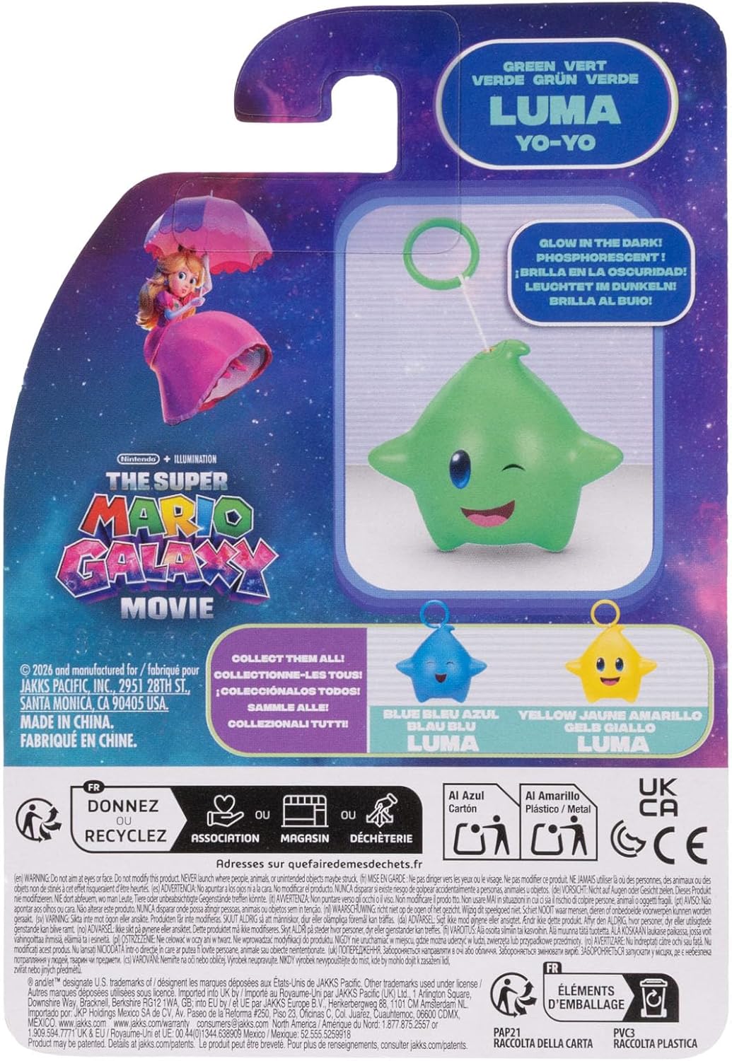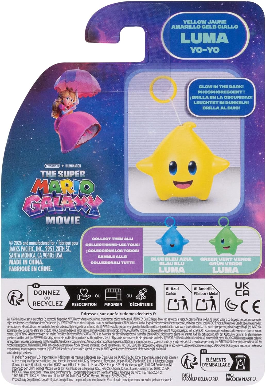 The Super Mario Galaxy Movie glow-in-the-dark Yo-Yo! 3-pack includes three Luma – blue, green and yellow. Each Luma is attached to a string that retracts just like a yo-yo. You can collect them all!