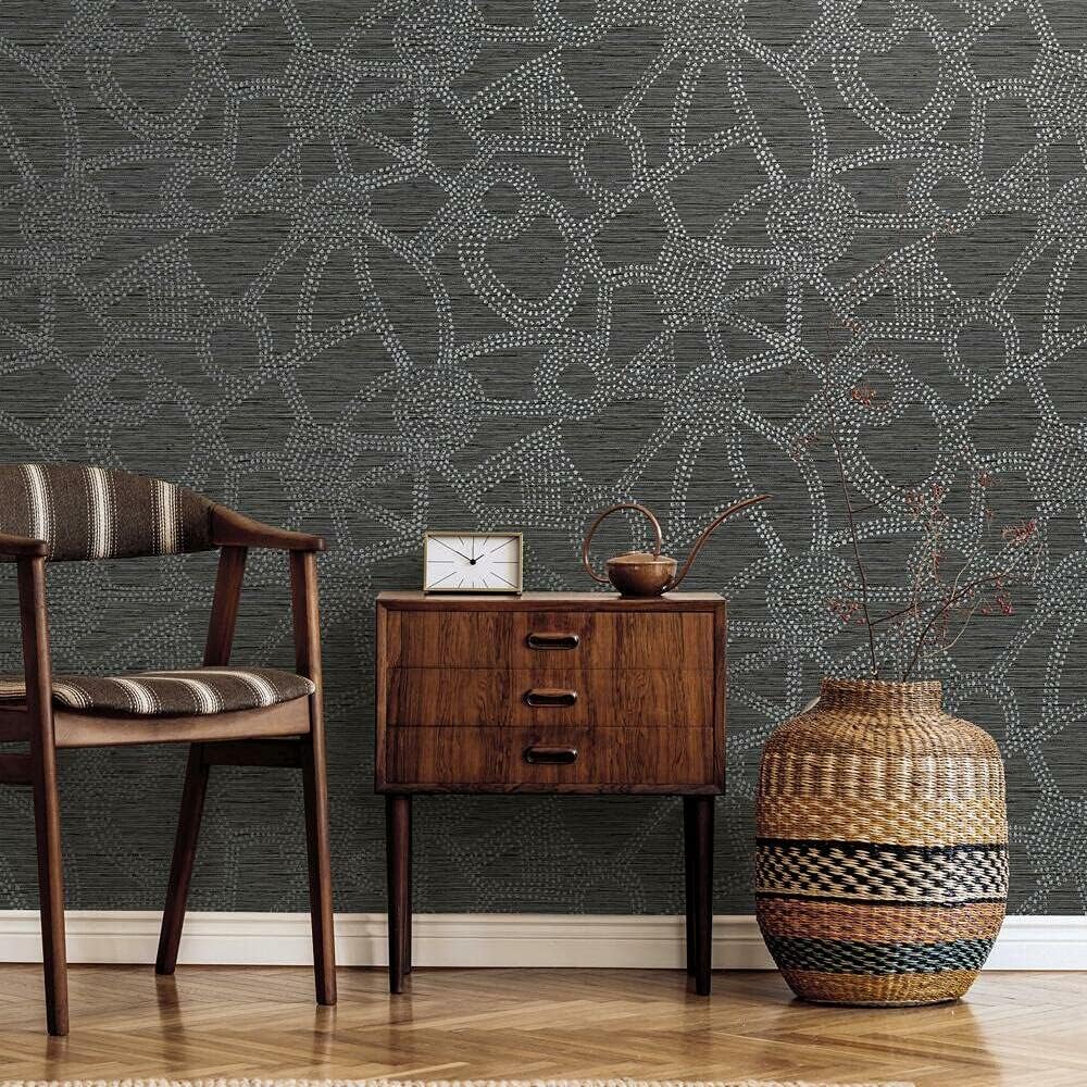 Inspired by the Amhara art that has nurtured painters since the Middle Ages, this Amhara peel and stick wallcovering by Nikki Chu for RoomMates captivates the eye with its abstract linework and loose dot textural fill.