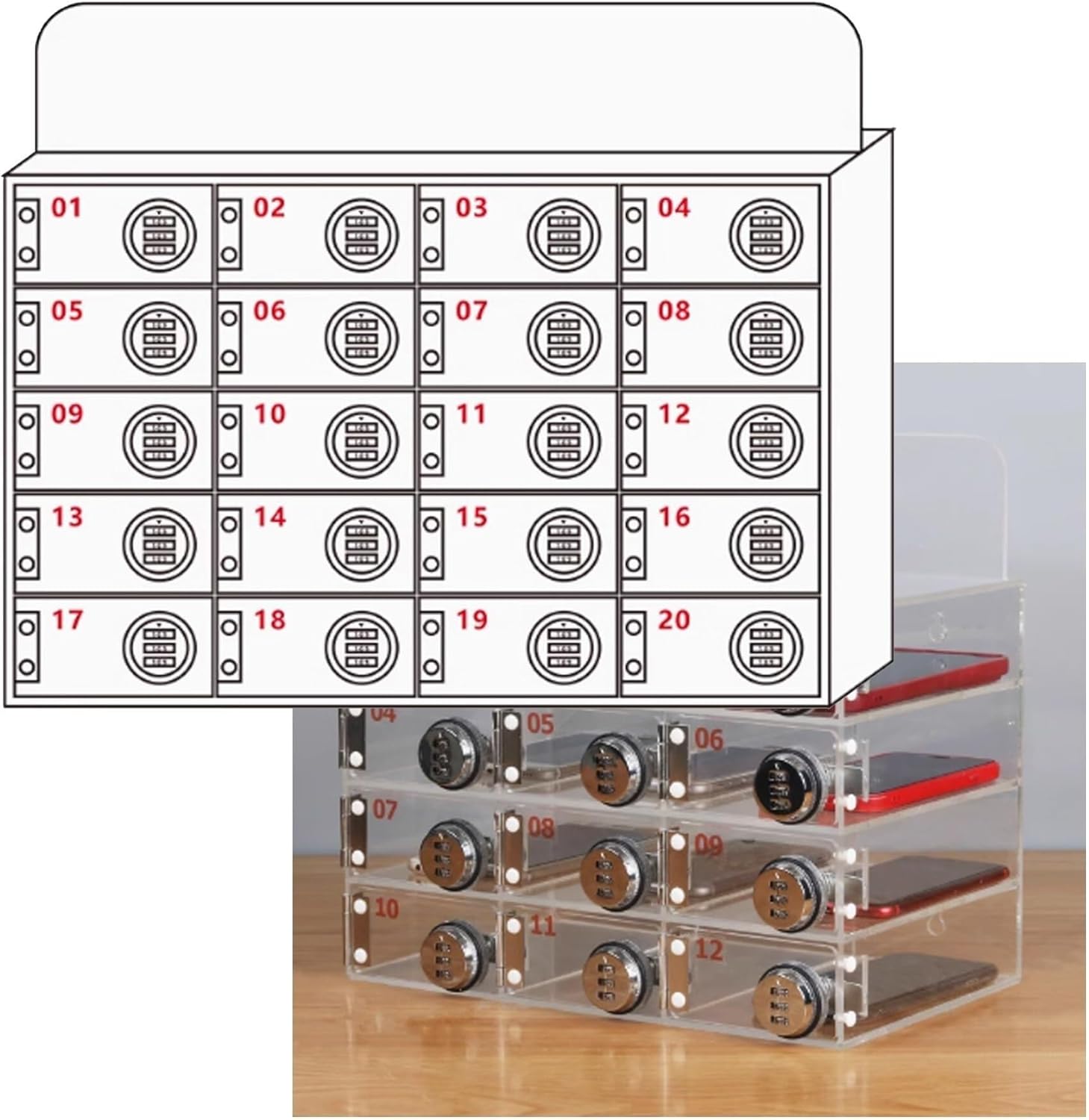 Secure & Convenient Mobile Phone Locker Box with Lock Key In today's world, mobile phones are essential, but there are many situations-such as at the gym, during important meetings, or in classrooms-where it's best to keep them out of reach. This wall-mounted cell phone storage box with Combination lock provides security while providing convenient to meet most storage needs. Is your ideal choice! The locker can be hand-held, wall-mounted, or placed flat on a surface. It includes wall-mounting buckles for easy hanging, and supports stacking, allowing you to purchase multiple units for larger storage needs. This cell phone storage cabinet is perfect not only for phones but also for keys, wallets, cards, and other small items. Ideal for classrooms, exams, office meetings, and similar settings where focus is key. This cell phone storage cabinet is perfect for a variety of settings, including conference rooms, cinemas, training rooms, factories, offices, confidential units, gyms, hospitals, schools, classrooms, dance studios, and training institutions.