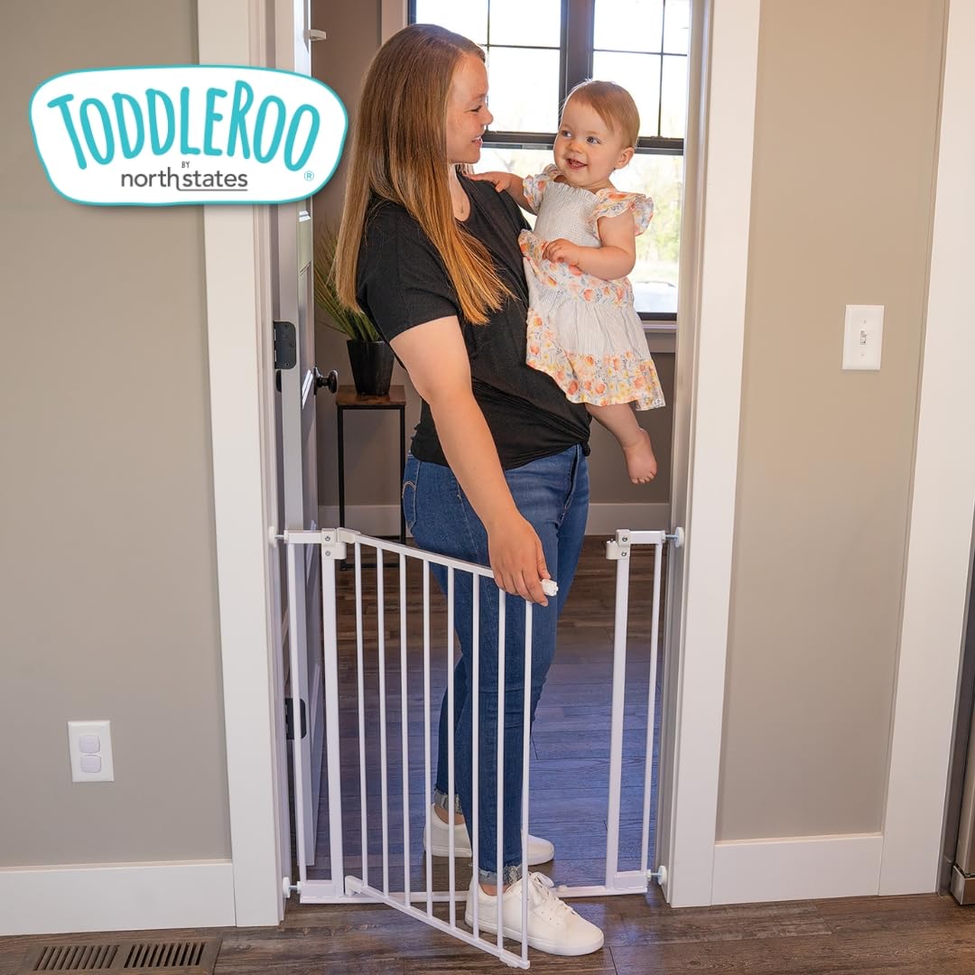 About the StepSafe Auto-Close Gate: Our baby gate has an extra-low threshold bar of just 0.25 inches high, which is 4 times lower than other safety gates! This reduces tripping hazards and creates effortless access. Perfect for babies and toddlers, this kids safety gate stands tall at 30 inches and adjusts effortlessly from 29 to 38 inches wide, fitting snugly into your space while keeping your tiny adventurer contained. The childrens gate can be pressure-mounted for easy set-up between rooms or hardware-mounted for secure use at the top of stairs. The wide 18" door provides plenty of room to walk through with ease and the gravity-fed hinge effortlessly closes it behind you. For those times when you want the gate to quickly remain open, just move the door past 90 degrees and the hold-open feature will kick in, preventing closure. The kids safety gate opens with just one hand, so you can juggle snacks, toys, and little ones like a pro. About Toddleroo by North States: We pride ourselves on U.S. manufacturing because it allows us to maintain the highest standard of quality control. Since 1953, our products have been built by skilled craftsmen and women who are dedicated to making the finest products in America. Our innovative, superior-quality products are designed to achieve the highest standards in safety, durability, and ease of use. You’ll always find us ahead of the curve and on the cutting edge of the industry. Perfect for babies and toddlers, this chic white baby gate is 30 inches tall and adjusts effortlessly from 29 to 38 inches wide, fitting snugly into your space while keeping your tiny adventurer contained. Flexibility is key! The StepSafe can be pressure mounted for easy set-up between rooms or hardware mounted for secure use at the top of stairs. Its wide 18" door provides plenty of room to walk through with ease and the gravity-fed hinge effortlessly closes it behind you. Plus, it opens with just one hand, so you can juggle snacks, toys, and little ones like a pro. For those times when you want the gate to quickly remain open, just move the door past 90 degrees and the hold-open feature will kick in, preventing closure. The StepSafe Auto-Close Gate is JPMA (Juvenile Products Manufacturers Association), and ASTM certified, having passed their rigorous certification programs, giving you peace of mind. Let the fun begin—safely!