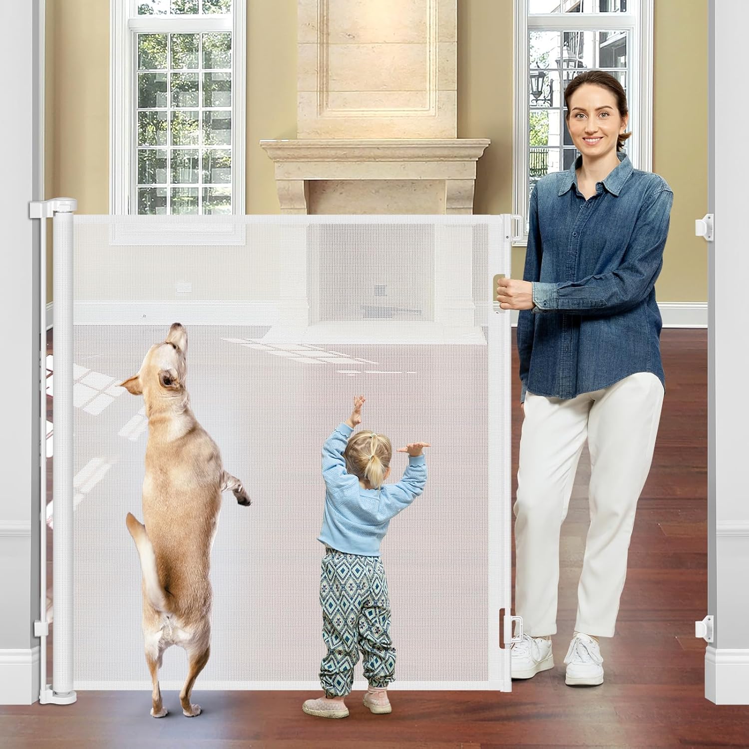 【48” X 145” Retractable Gate】 【Saving Space & Easy to Pass】 【As a Room Divider】 【Suitable for Any Skirting Lines】 【Suitable for Indoors/ Outdoors】 【48” X 145” Retractable Gate】 The 48” extra tall pet gate keep your cats and dogs from jumping over the retractable mesh gate and babies from touching the top of the mesh. It can also prevent babies and pets enter some dangerous places. 【Saving Space & Easy to Pass】 The mesh gate can be retracted out of the way when not in use. It can be completely rolled up for saving space. This extra wide baby gate have no bottom bar so that you won’t be stumble for that. 【As a Room Divider】Besides a retractable baby gate, it is a room divider. You can use it to divide an area as a play yard for kids. And you can also divide the room to create a individual place so that you can focus on your work or study without being disturbed by anyone. 【Suitable for Any Skirting Lines】Adjust the bottom bracket’s height to avoid the problem of skirting line. You can install it close to the ground so that babies and pets can not crawl through under the mesh baby gate. 【Suitable for Indoors/ Outdoors】 Extra wide baby gate suitable for indoors and outdoors such as bedrooms, living rooms, kitchens, fireplaces, hallways, doorways, decks, patios, garages and so on. This indoor/ outdoor retractable gate provide a safe place for kids or pets to play.