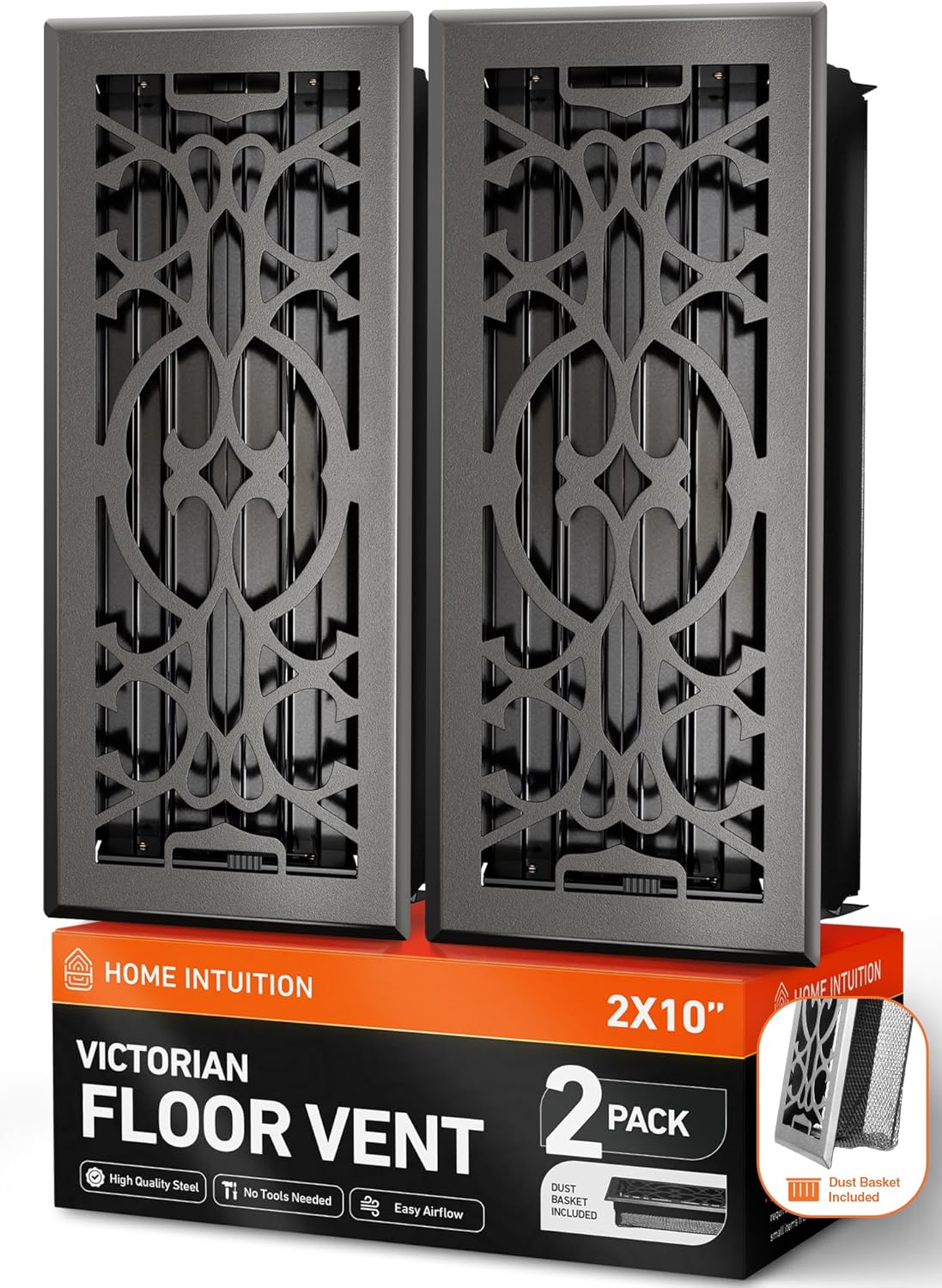 Vent covers are an essential part of any ventilation system, allowing you to redirect the airflow from your HVAC unit to where it is needed most. Make your home more comfortable, control how much you spend on your monthly heating/cooling bill, and elevate the appearance of the room with Home Intuition Floor Vent Covers.AVAILABLE COLORS:Matte BlackSatin NickelAVAILABLE SIZES:2 x 10 Inch2 x 12 Inch4 x 10 Inch4 x 12 InchCOMPATIBLE WITH: Home Intuition Heat DeflectorsEASY ADJUST AIR SUPPLY LEVEROur elegant vent covers include a sliding lever to adjust the built-in louvers for more or less airflow. Choose to open the vent, close it completely, or leave it partially open. Redirect warm or cool air where it is most needed. For rooms that don’t see much foot traffic, keep vents closed. In rooms that require major heating or cooling, leave the vents open. Use your foot to adjust without bending over.DECORATIVE VISUAL APPEALAre you sick of looking at ugly, functional grates with no charm or personality? Make an impression on any room with these decorative vent cover options. Choose from three versatile designs to match your home decor and interior decorating style.INCLUDES LINT CATCHER BASKETIncludes a mesh basket with fine holes that allow the air to pass through. Catch debris and prevent tiny items from falling through and getting lost in the ductwork. Fit the mesh basket directly onto the back of the vent cover -- no tools required. Guarantees long-term use without affecting normal ventilation.PLEASE NOTE: Avoid frequent exposure to water and cleaning agents as it will increase the chances of rusting.ABOUT USSince 2013, Home Intuition has become a symbol of fulfillment in the housewares industry. Despite humble, homegrown, basement beginnings, Home Intuition has matured into a fully diversified, multi-channel re-seller with global exposure.
