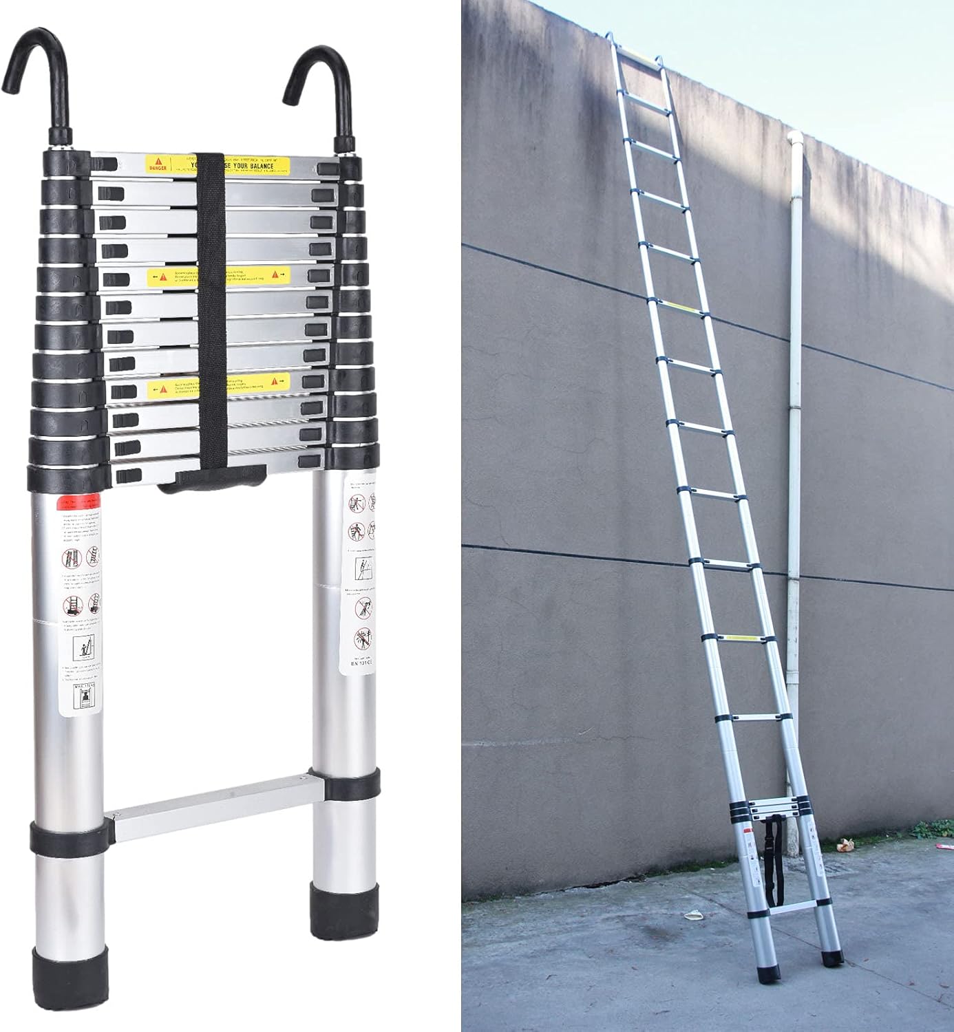 • ▶Safe and Compact: Comes with 2 Hooks for secure fixing. Featuring durable aluminum design, industrial-grade height-locking latches and solid anti-slip rubber-tipped feet on the bottom of ladder step. The telescopic ladder is approved by safety standard EN131.
