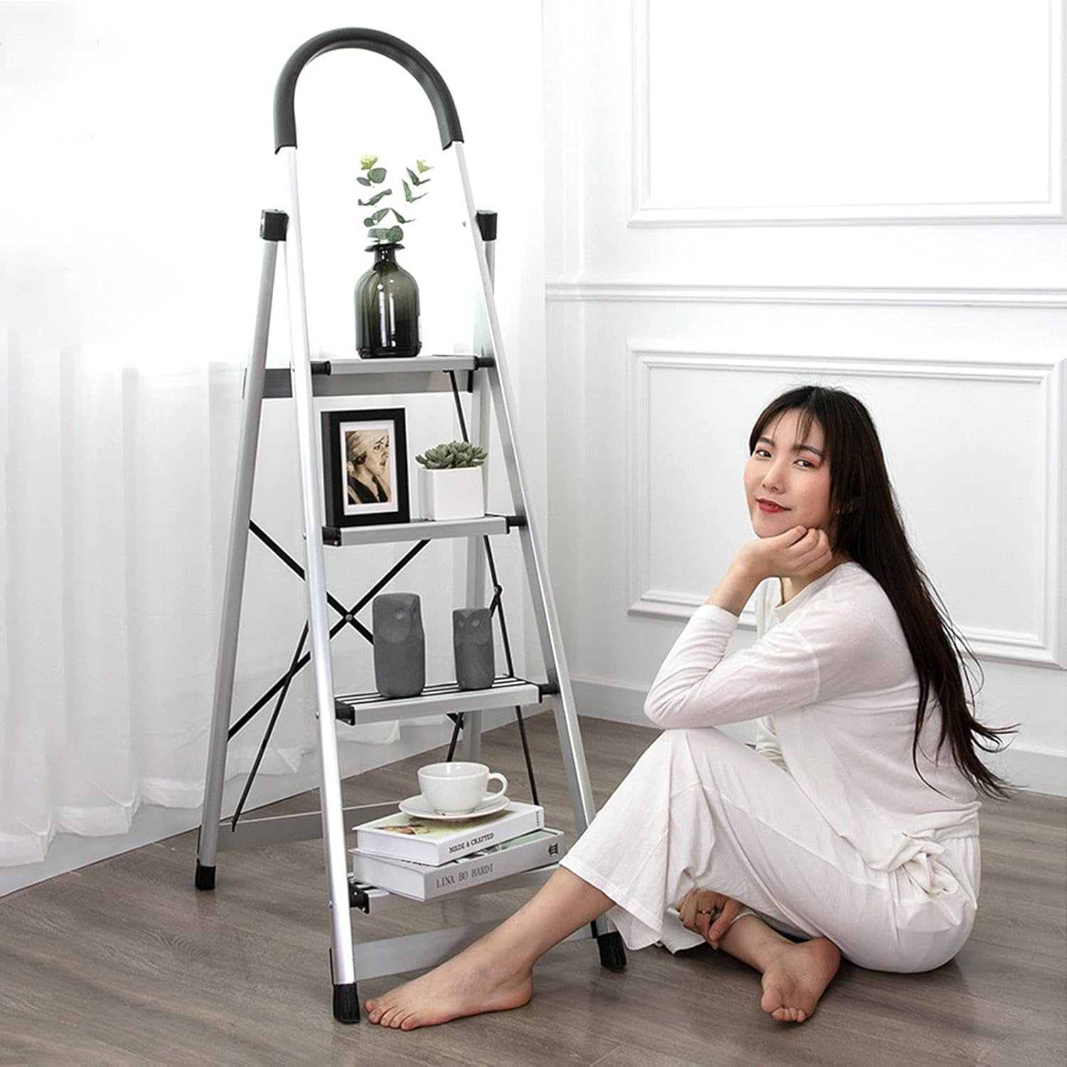 If you are looking for a multifunctional ladder with an attractive appearance, this is it! Different colors can match your home decor. Whether you need extra height for cleaning, painting, or as a resting stool. Or it can be used as a step stool for small pets. Folding step stools can withstand repeated use well. This is an ideal choice, whether it's your home or shop!Specification:Product name: StepladderStyle: SimpleMaterial: Wood/MetalBearing weight: 150KG/330lbFunction: Can be used as a stool/Ladder/Shelf/Storage shelf/Flower shelf/EaselApplicable people: AdultsApplicable occasions: Home/Office/Garden/OutdoorPackage includes: 1* Step ladderFeatures:- Ladder stool combine practicality with stylish. The ladder provide you the convenience of your life and it will match any interior design of your house .- High quality, sturdy structure, long service life- Easy to fold, easy to carry, save space- Great for helping clean when you are trying to reach hard-to-reach areas- Very suitable for painting and decoration- Very suitable for any work that needs to increase the height- Suitable for all other DIY workWe are committed to providing customers with the highest quality products.If for any reason you are not satisfied with your purchase, please contact us directly and we will do our best to help you.