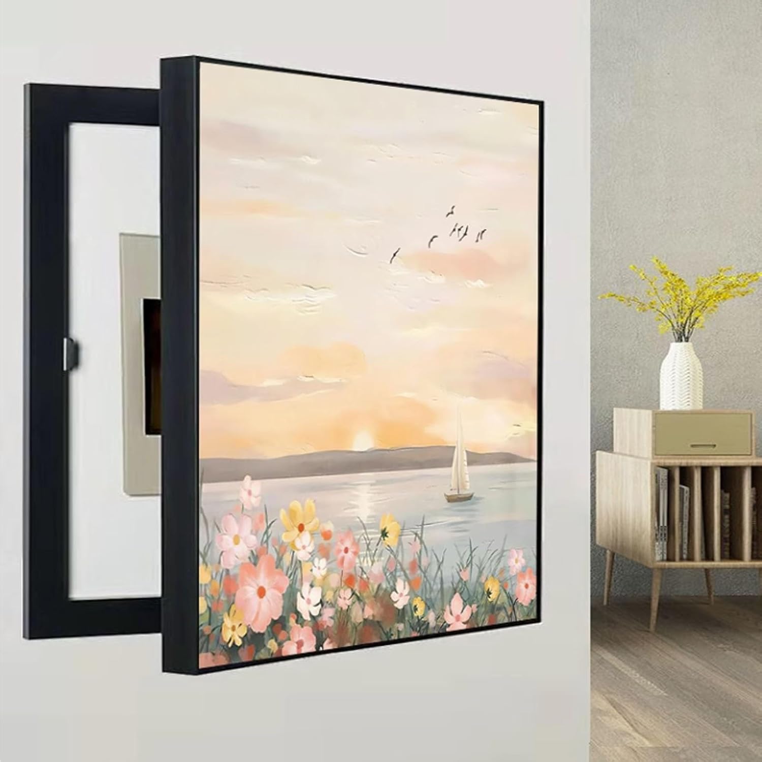 Designed to blend seamlessly with your interior decor, this breaker box cover decorative transforms a plain electrical panel into an elegant wall accent. Made from high-quality materials, it ensures durability while adding a touch of sophistication to any roomDecorate your space with our exquisite art frames. The GUAWJRZDP meter box decorative cover can cover the regrets left during the decoration process for you, so that you can have a perfect wall. It can also prevent household electric shock accidents while enhancing the beauty and taste of the home● Product parameters:Product Name: Distribution box decorative painting/decorative fuse box cover/electrical panel coverFrame Material: PS materialSwitch Type: Flip-TopFrame Color: BlackDimensions: 30x40cm/11.8x15.7in , 35x45cm/13.8x17.7in , 40x50cm/15.7x19.7in , 40x60cm/15.7x23.6in , 45x55cm/17.7x21.7in , 50x60cm/19.7x23.6in , 50x70cm/19.7x27.6in , 60x70cm/23.6x27.6in , 60x80cm/23.6x31.5inMounting Type: Wall-MountPackage Contents: 1 x Circuit Breaker Box Cover, Mounting AccessoriesSuitable scenarios: Kitchen, living room, entryway, bedroom, dining roomKind tips: Please measure the dimensions of your distribution panel meter before purchasing. The dimensions must not exceed the area covered by the meter cover art (as shown in the size chart).● Note:1. There may be some differences between the picture and the product due to display and lighting, please refer to the actual product.2. Because it is processed by hand, the finished product usually has an error of 1-2 cm, please understand.
