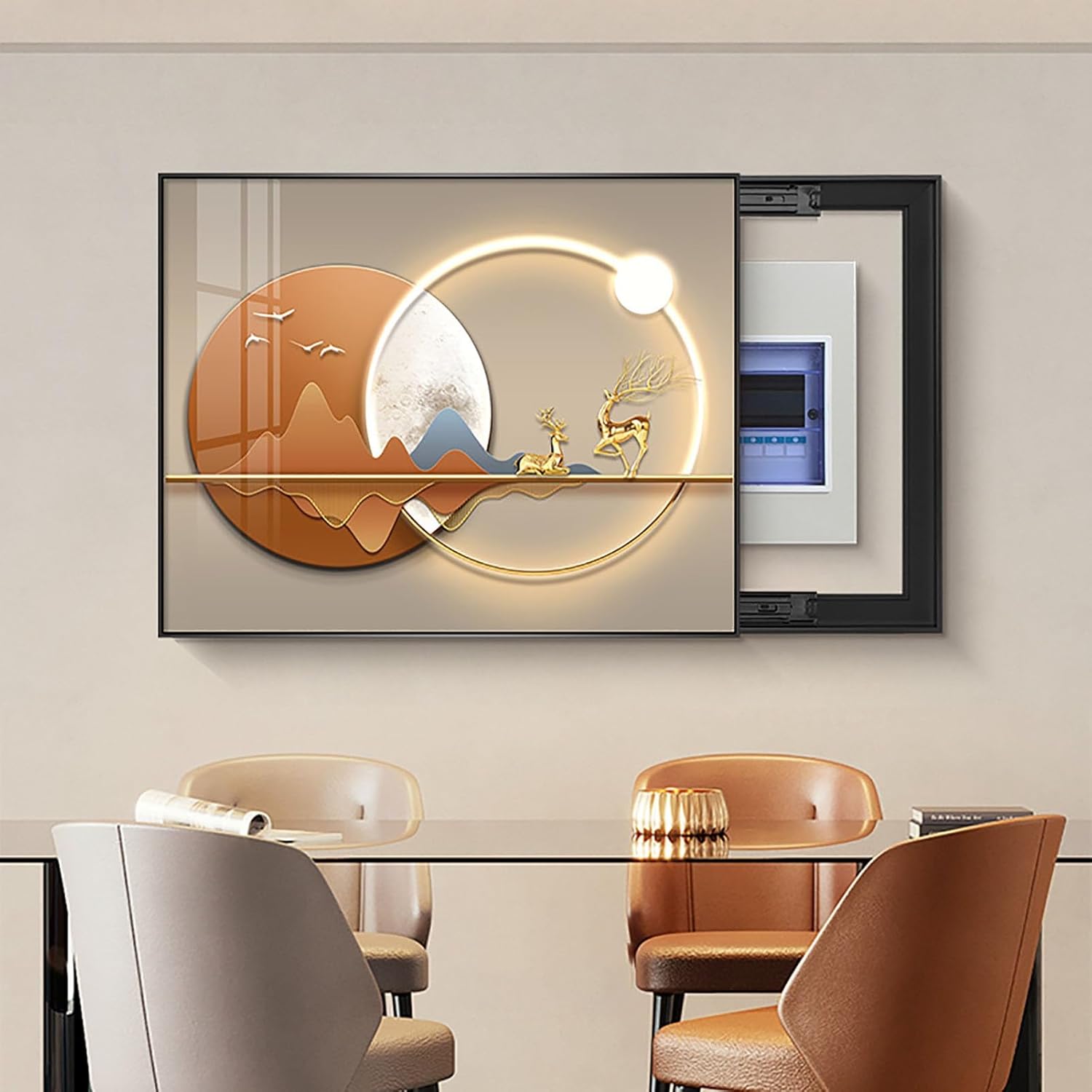 Decorative paintings can easily hide electrical panels, sockets or any other place you want to hide for a cleaner and more refined look.Frame color: blackPainting material: crystal filmFrame material: PS materialInstallation method: traceless nailsProduct size: length x widthAccommodation area: length - 10cm, width - 10cmPackage included:1 x Meter Box Decorative Cover