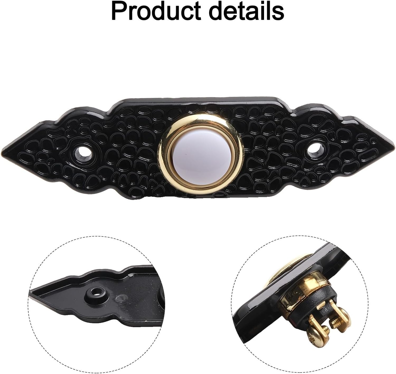 Product description Features:*Sturdy Material:This doorbell push button is made from Zinc Alloy material, its durability and longevity. It is built to withstand the for elements and daily use, making it perfect for front doors of homes.* Illuminated Button:Equipped with a built-in light, which illuminates the button when pressed. This adds a touch of elegance to your front door and makes it easier to locate the button in low-light conditions, providing convenience and safety.*Easy Installation:Our doorbell push button can be effortlessly mounted on any wall. It is compatible with most wired doorbell systems, making it for versatile for front doors or garage door openers.*Sleek and Stylish Design:Whether you have a modern or for traditional style, this button will seamlessly blend in. Its simple yet elegant appearance enhances the overall aesthetic appeal of your front door.*Weatherproof Design:Designed to withstand all weather conditions, the doorbell push button is weatherproof, protecting it from rain, snow, and extreme temperatures. This ensures its functionality and longevity, allowing you to enjoy its benefits for years to come.Specifications:*Product Name:Doorbell Push Button*Material:Zinc Alloy*Size:3.82x1.06inch*Color:Black*Voltage range: DC12-24VPackage Content:1 x Doorbell Push Buttonfor 2 x Screws Manufacturer Contact Information no