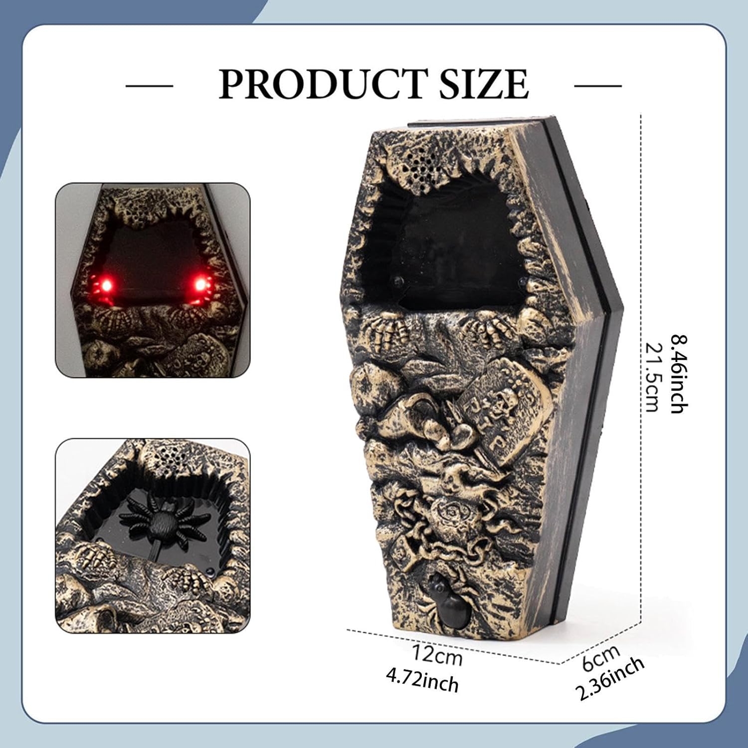 Product description Description:[SPOOKY COFFIN DESIGN]: Greet your guests with a uniquely creepy, coffin shaped doorbell that instantly sets a chilling atmosphere. A standout piece for your haunted room theme or party entrance[INTERACTIVE THRILLS WITH LIGHT & SOUND]: Dare to press the button! The lights will flash with an eerie red glow as it lets out a series of spooky sounds, designed to startle and delight trick or treaters and party guests alike[SURPRISE JUMP SCARE ]: A creepy lunges out with each press! This unexpected prank adds an extra layer of frightful fun, guaranteeing screams and laughter[VERSATILE INDOOR & OUTDOOR DECOR]: Whether you're decorating your front porch to welcome trick or treaters or setting up a haunted hallway indoors, this doorbell is a great fit. Its ABS construction is suitable for both indoor and covered outdoor use[EFFORTLESS & CORDLESS INSTALLATION]: No complicated wiring needed. Simply use the mounting hole on the back to hang it on any door or wall. It is powered by batteries (not included), allowing you to place it anywhere for instant spooky entertainmentSpecification:Material: ABSSize Chart:12cmx6cmx21.5cm/4.72inchx2.36inchx8.46inchPackage Includes:1 Decoration DoorbellNote:Please allow slightly errors 1-2cm/0.39-0.79inch differences due to manual measurement. Manufacturer Contact Information Customer Care : (+91-9355851534), lrecomllp@gmail.com