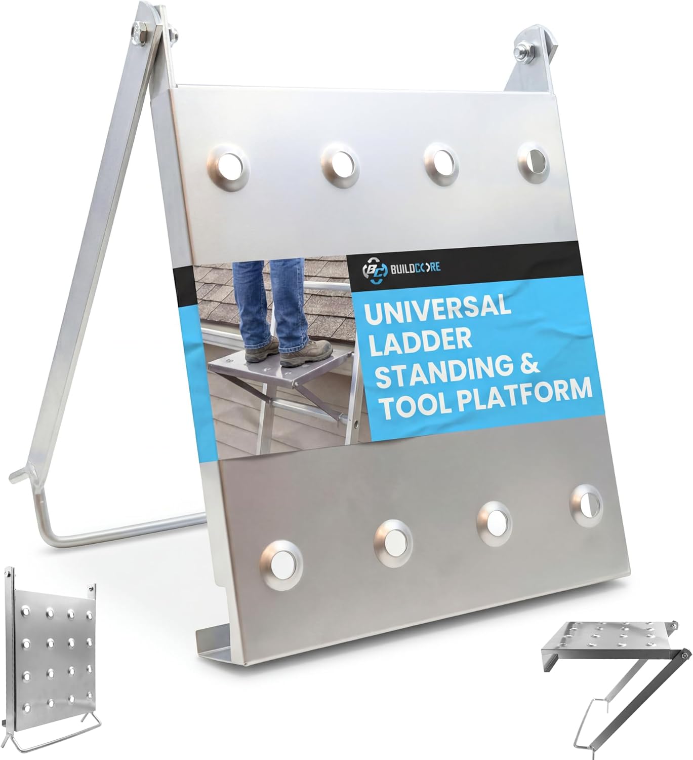 A rung is not a platform. This is.Balancing on a ladder rung works for thirty seconds. For a two-hour painting job, an electrical rough-in, or a full gutter clear, it becomes the most uncomfortable part of the work. Your foot angles, your calf tightens, your focus shifts from the job to the ladder. This platform changes that completely.The 11.8in x 10.4in (30 x 26.5 cm) aluminum standing surface mounts at adjustable height to fit where you need it on the ladder. The platform is rated to 400 LBS — enough for the worker, a tool belt, and whatever supplies you're bringing up. The non-slip surface grips your boots in wet and dry conditions, and the aircraft-grade aluminum frame won't flex, corrode, or fail in outdoor environments.The mounting system adjusts to fit straight ladders, extension ladders, and step ladders — no adapters, no fiddling with compatibility. Install it in under a minute, work through the job, and fold it flat when you're done. It stores in a tool bag, a work van, or on a garage shelf without taking up meaningful space.Used by professional painters, electricians, and HVAC technicians who spend hours on ladders every week — and by homeowners who want the same working comfort on their weekend projects. It makes a practical, lasting gift for anyone who works at height regularly.Note: Platform dimensions are 11.8in x 10.4in (30 x 26.5 cm). Please confirm measurements fit your ladder step before purchasing.More room. Less strain. Better work.