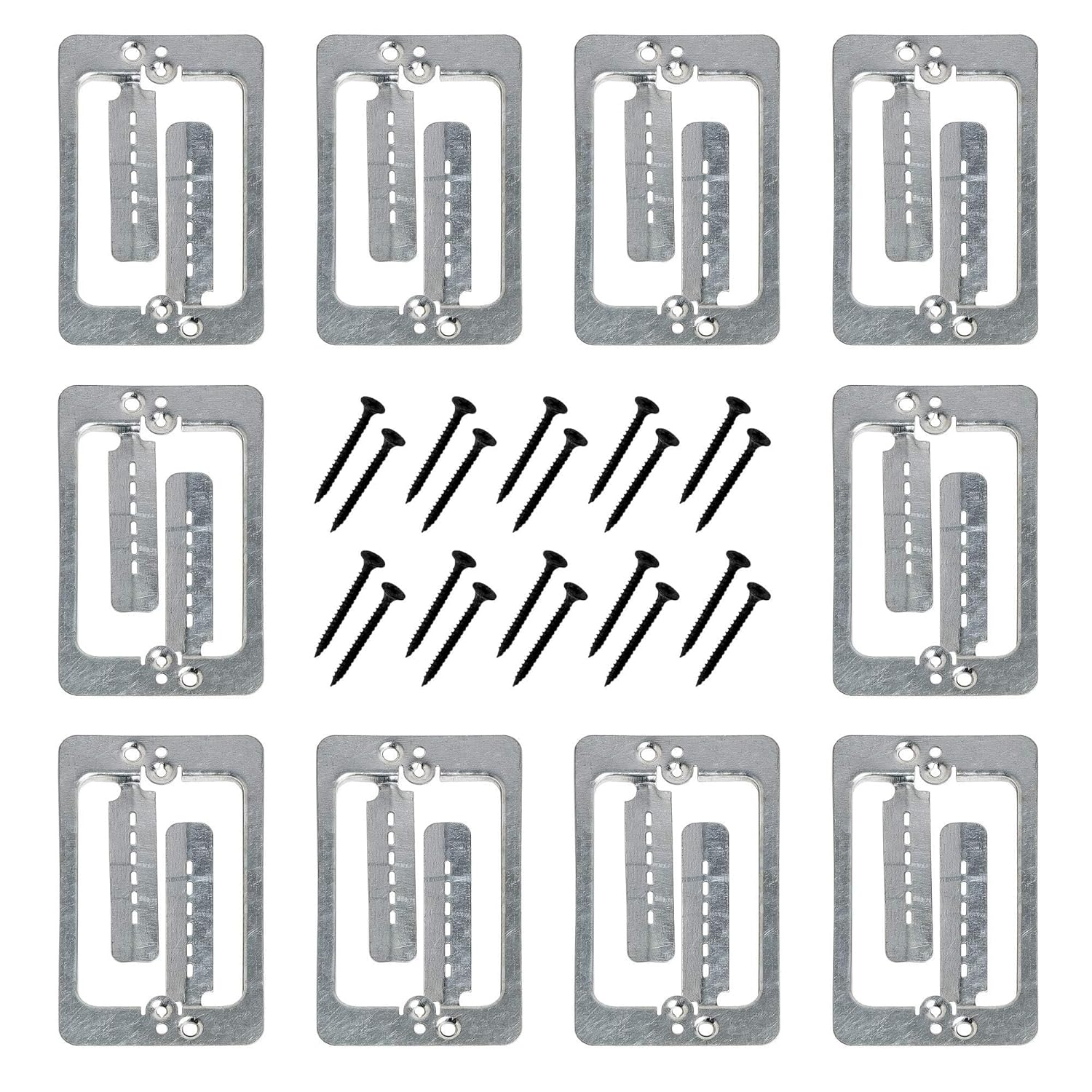 10 PACK - Dual Gang Low-Voltage Mounting Bracket Color may vary. You might receive orange or black color pack Cmple 2-Gang Low-Voltage Old-Work Bracket is specially designed for the installation of Low-Voltage devices in an existing wall.The backless box design accommodates the space and bend-radius requirements of coaxial or data/communication cables andeliminates the need for metal plates, lags or screws. Non-metallic polyvinyl chloride resists rust, corrosion, impact and thedamaging effects of sunlight. Specifications & Features: Aids in the installation of low-voltage devices such as a cable television, data communication or telephone jacks in an existing wall Non-metallic PVC is heat, fire and corrosion resistant Backless to accommodate deep devices and bend-radius requirements Can be installed vertically or horizontally 2-vertical screw-mount options Quick and easy to install What's in the package: 10PCS - Double Gang Low-Voltage Brackets, Orange Dimensions: 4.30 x 4.30 x 1.75” Designed for the installation of low voltage device in an existing wall, this 2-Gang Non-Metallic Low Voltage Old Work Bracket.The backless box accommodates the bend-radius requires of coaxial or data/communication cables.