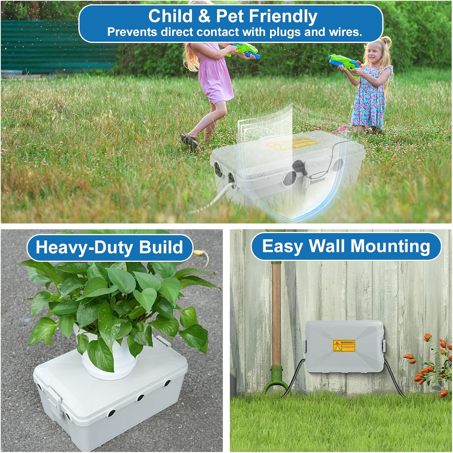 Keep your outdoor electrical connections safe, dry, and organized with the NineLeaf 2 Pack Large Outdoor Electrical Box Set. This bundle includes two large waterproof boxes (black & grey), each measuring 12.5 x 8.5 x 5 inches, providing generous space for power strips, plugs, timers, and sockets. Rated IP54 waterproof and dustproof, the boxes effectively shield electrical connections from rain, snow, and debris, ensuring reliable performance in any season. Built from heavy-duty reinforced PP material, each box is designed to resist UV rays, impact, and harsh weather for long-term outdoor protection. Perfect for use in gardens, patios, workshops, yards, or during holiday decorations, the two-color set helps you easily distinguish and organize power sources for different applications. A practical and durable solution for managing all your outdoor electrical setups — choose NineLeaf for safety, simplicity, and versatility.