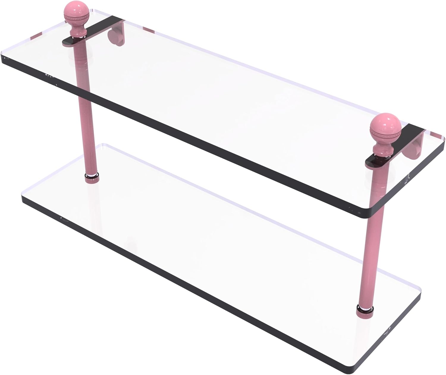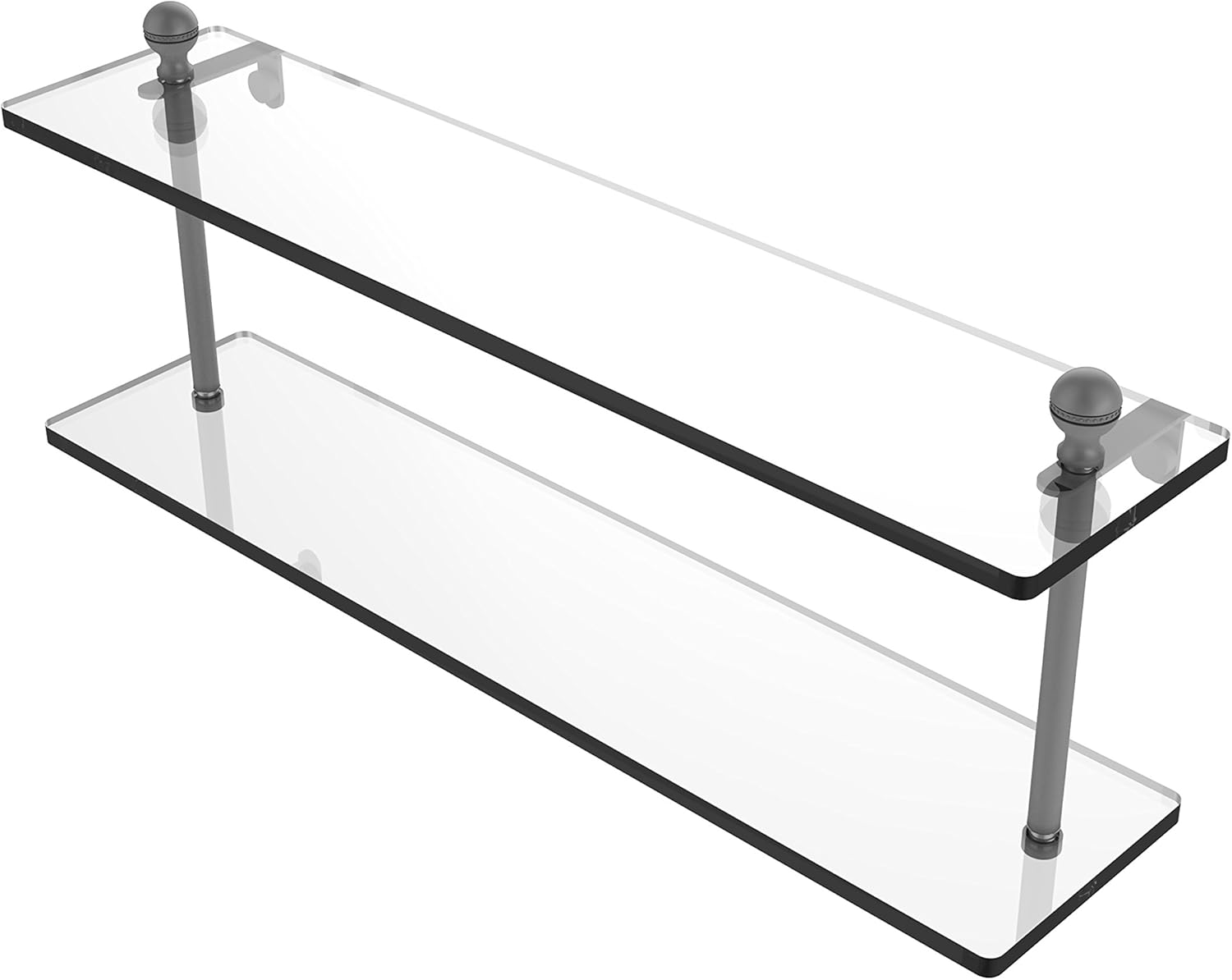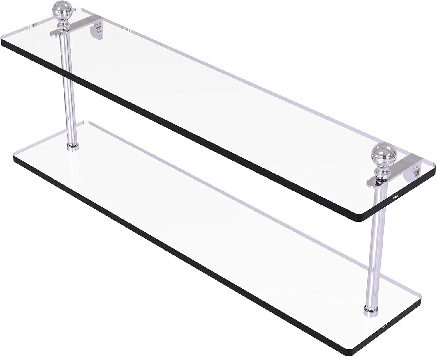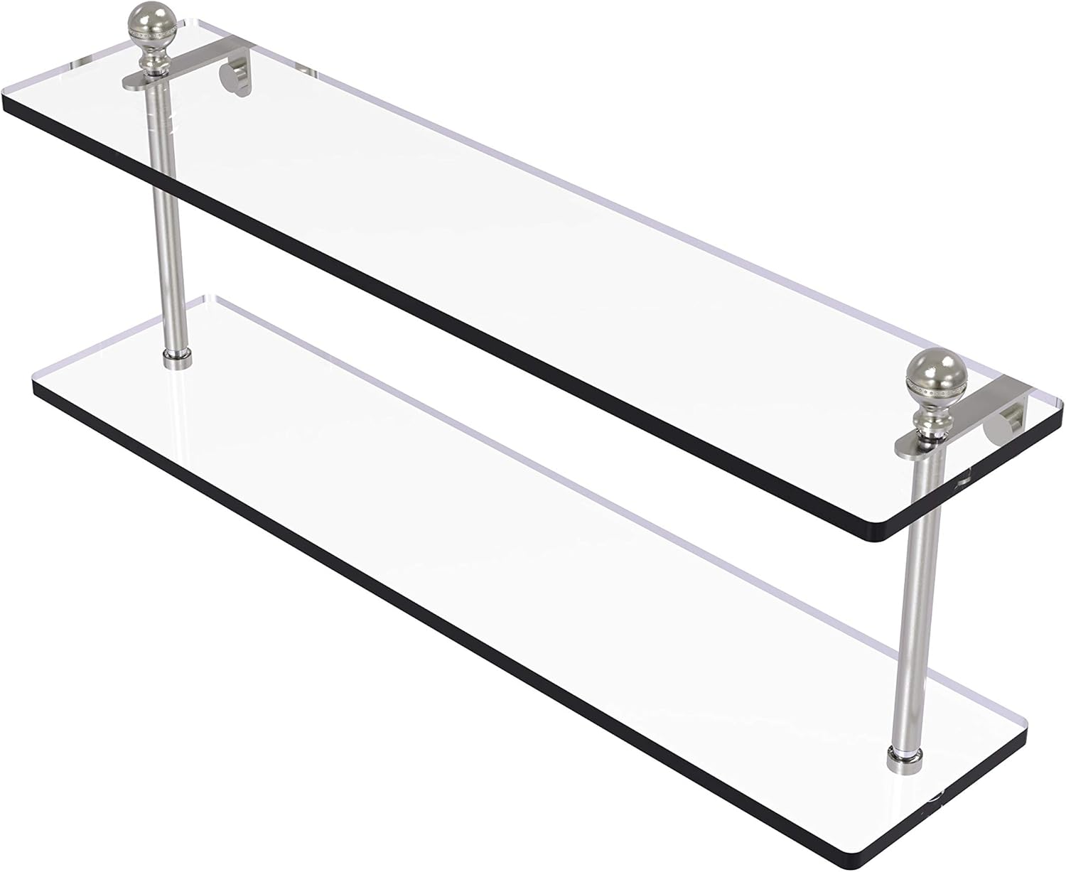 Product Description Add space and organization to your bathroom with this simple, contemporary design 2-tier glass vanity shelf. Featuring tempered, beveled-edged glass and solid brass hardware this shelving unit is crafted for durability, strength and style. One of the many coordinating accessories in the Allied Brass collection of products, this subtle glass shelf unit is the perfect complement to your bathroom decor. From the Manufacturer In fact everyone would like to decorate a bathroom and that gets the least amount of decorating focus. This Glass Shelf is a great way to display your products in your gallery, rooms and bathroom with the two solid brass arms support very well. We are one-step ahead in producing an exclusive collection of glass shelves. We are giving warm welcome the customer from all over the world.