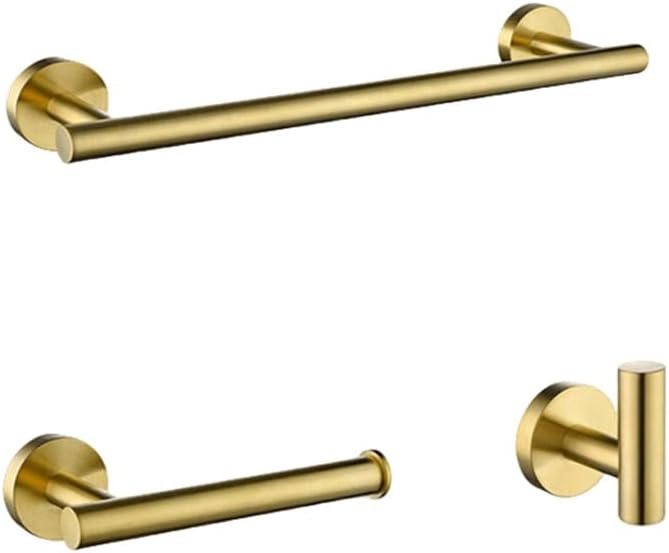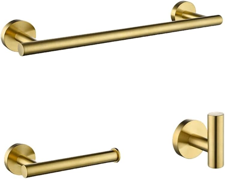 Bath Hardware Set Finishing:BrassSurface Finishing:BrushedMain Material:MetalMaterial:SteelType:Bath Hardware SetsColor:Brushed GoldRaw Material:Stainless SteelHigh-Quality Materials: Our bathroom hardware set is made of high-quality 304 stainless steel, which can prevent corrosion, rust and scratches. Mirror polished, presenting a modern feelSleek Wall Mounted Bathroom Accessories :The wall mounted towel bars can be best for you if you like its sleek and modern design. Even if you decide to change your bathroom’s overall design, you know that it will still fit with the rest of your bathroom.Strong Load-Bearing Capacity: Wall-mounted installation is more firm and reliable than self-adhesive installation, and the load-bearing capacity is greatly improved (10-30kg). After installation, you can use the bath towel bar, toilet paper holder, towel robe hook and towel ring immediately without waiting, without worrying about falling objectsEasy To Install: All the screws and anchors provided are of good quality, and the screws are concealed to make the appearance more clean and beautiful. The towel rail set can be mounted on a variety of surfaces, including but not limited to painted walls, gypsum walls, concrete walls, wallpaper, wood, marble