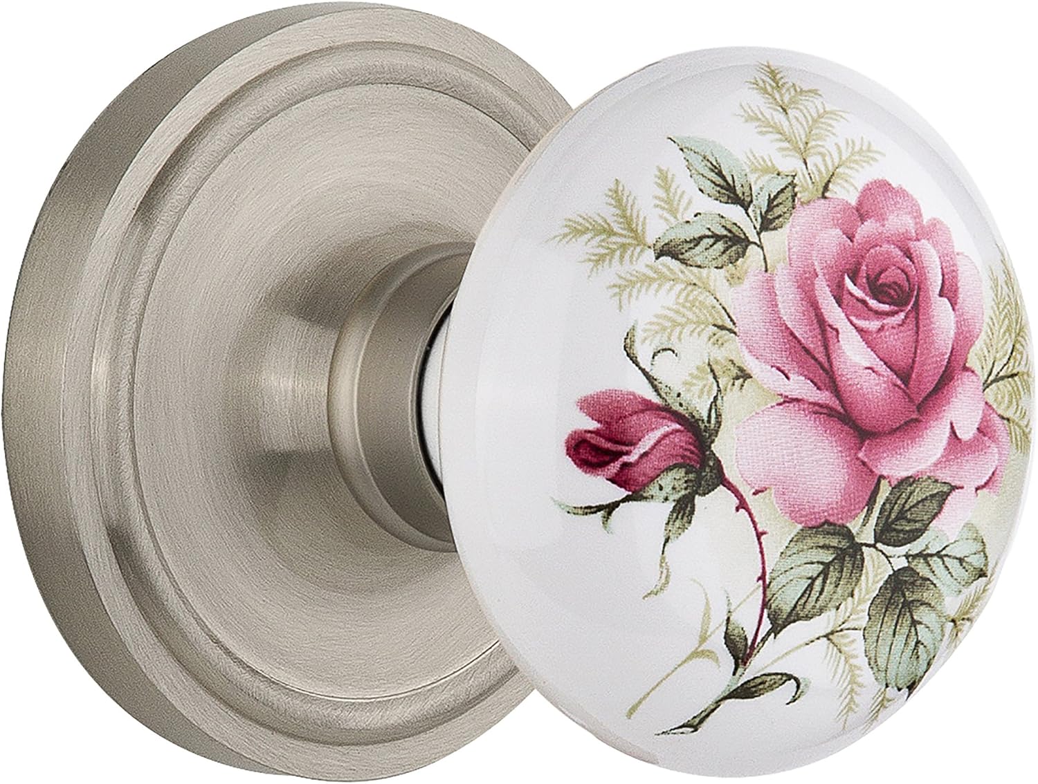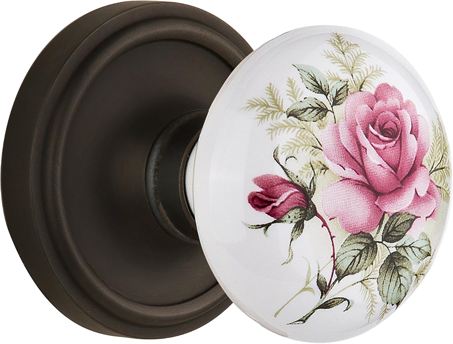 Product Description The simple elegance of the Classic Rosette in antique brass offers beauty and durability that will compliment a variety of architectural styles. And, nothing says "vintage" like the traditional floral illustration of the White/Rose Porcelain Knob. All Nostalgic Warehouse knobs are mounted on a solid (not plated) forged brass base for durability and beauty. From the Manufacturer The simple elegance of the Classic Rosette in antique brass offers beauty and durability that will compliment a variety of architectural styles. And, nothing says "vintage" like the traditional floral illustration of the White/Rose Porcelain Knob. All Nostalgic Warehouse knobs are mounted on a solid (not plated) forged brass base for durability and beauty.