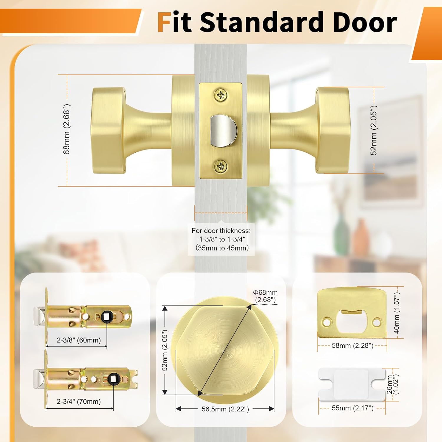 Specification: Backset: Adjustable to 2-3/8" or 2-3/4"(60mm or 70mm) Door Thickness: 1-3/8" or 1-3/4"(35mm-45mm) Handing: Left, Right, Reversible Knob Diameter: 2.24"(57mm ) Easy to Install: Installation is easy, all you need is a screwdriver and a little time.This set is designed to fit standard prep doors and most installations should take less than an hour.High quality: ANSI Grade 3 certified which indicates excellent performance across a range of residential applications. This product is built from high-quality materials to give you exceptional security.