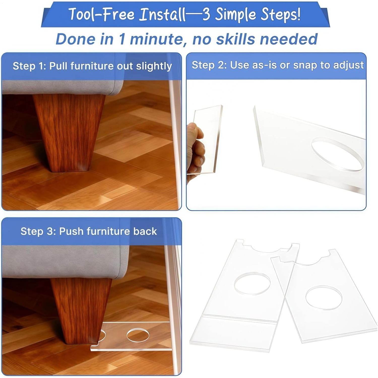The Under Bed Furniture Protector is constructed of durable acrylic material, ensuring a clear and transparent design that integrates seamlessly with any decor. Its adjustable feature allows for a perfect fit, making it suitable for various types of furniture such as beds, cabinets, tables and chairs. Designed with non-slip properties, this protector ensures safety by preventing slippage and reducing fire risks in homes, apartments, hotels, commercial spaces and college residences. The scratchable exterior provides long-lasting protection, maintaining the integrity of your furniture while protecting floors from damage. Ideal for everyday use, this versatile protector improves stability and safety in multiple environments. Specification Name: Sofa Dividers and Furniture Protectors Material: acrylic. Colour: clear. Product size: about 22.9 x 1 0.1 cm/9.02 x 3.94 inches. Thickness: about 0.5cm/2inch List 2 x Sofa Wall Spacers Note: 1. Due to lighting effects and viewing angles, there may be color differences in the product. 2. Due to manual measurement, there may be errors in the product size, please understand.
